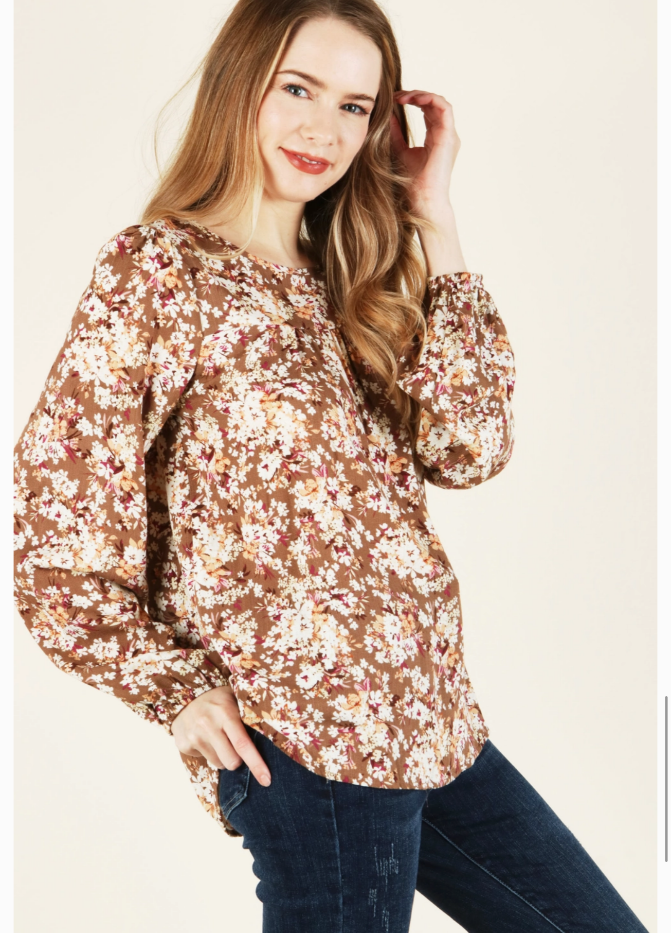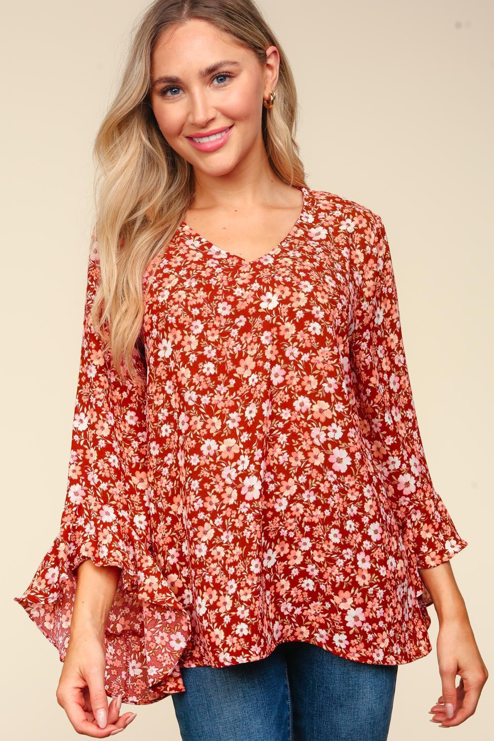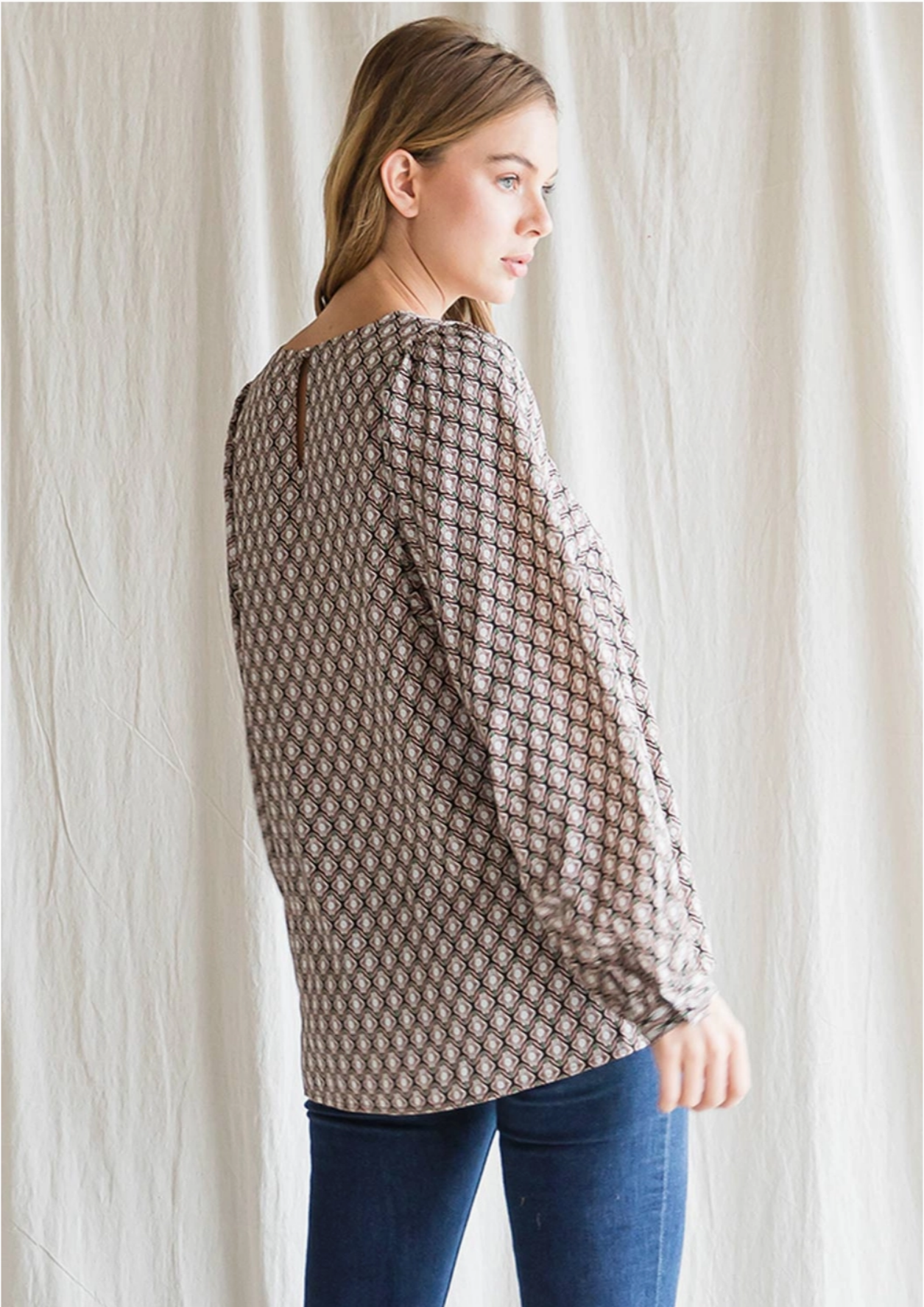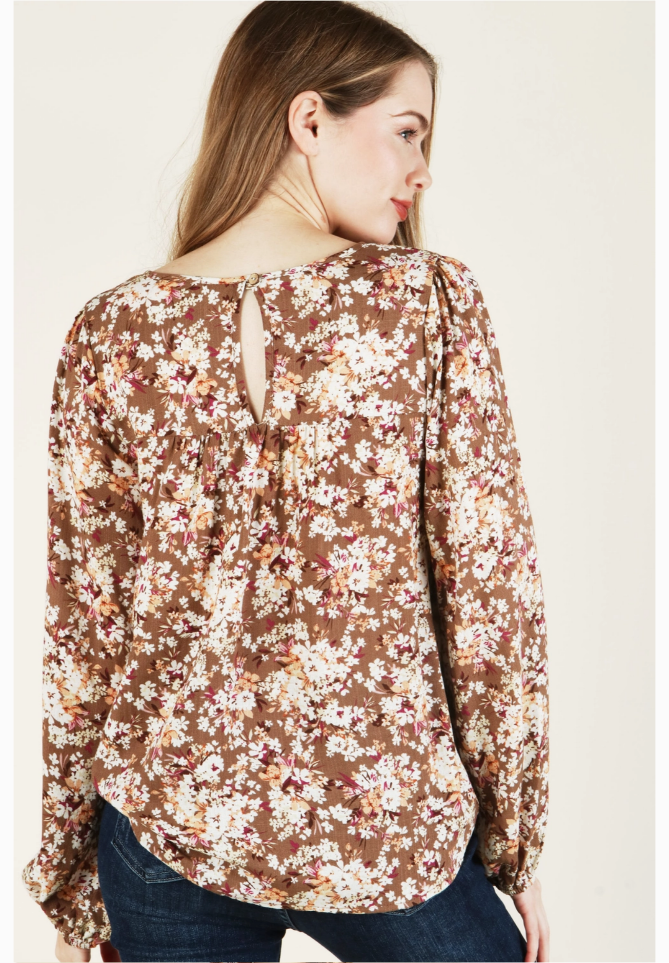 Woven Floral Long Sleeve Top - Back Button Key Hole
