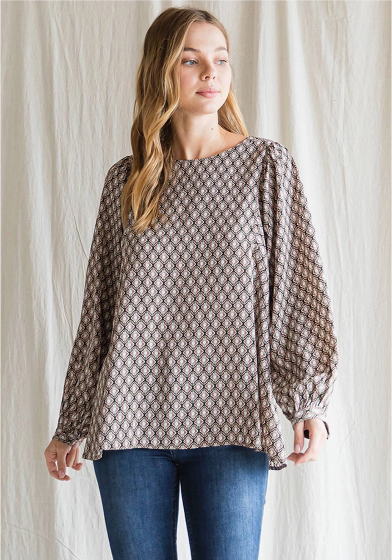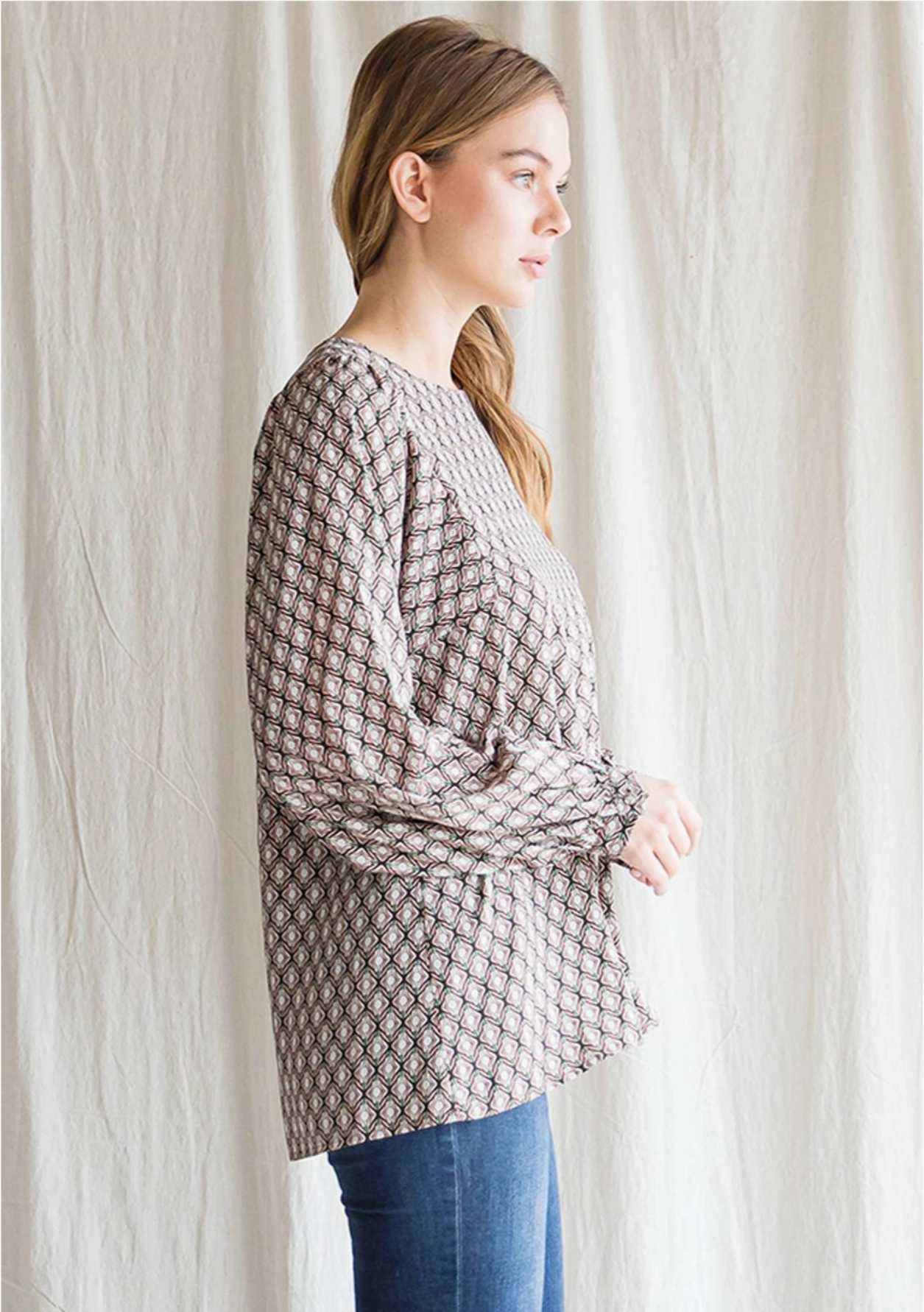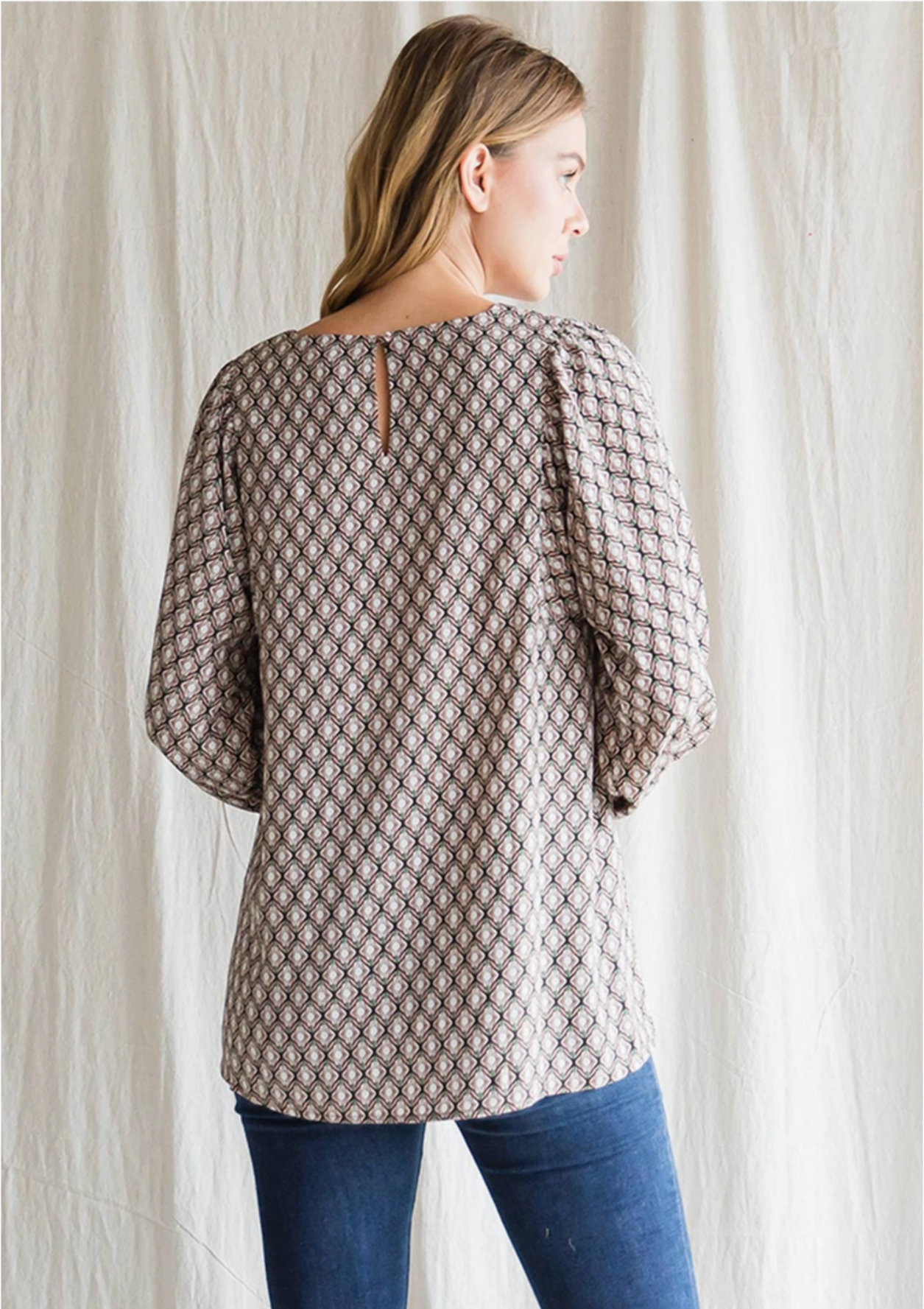 Woven Floral Long Sleeve Top - Back Button Key Hole
