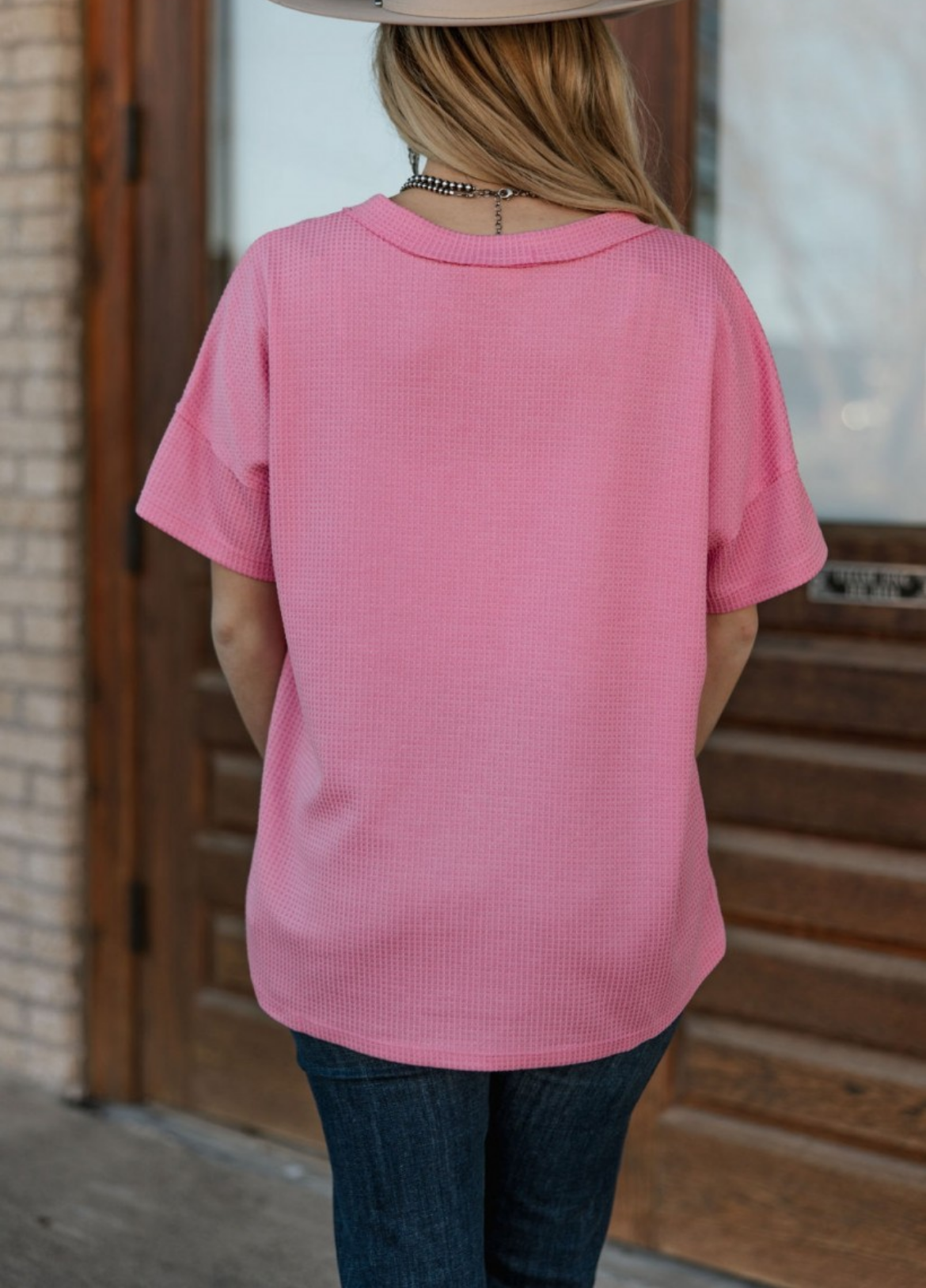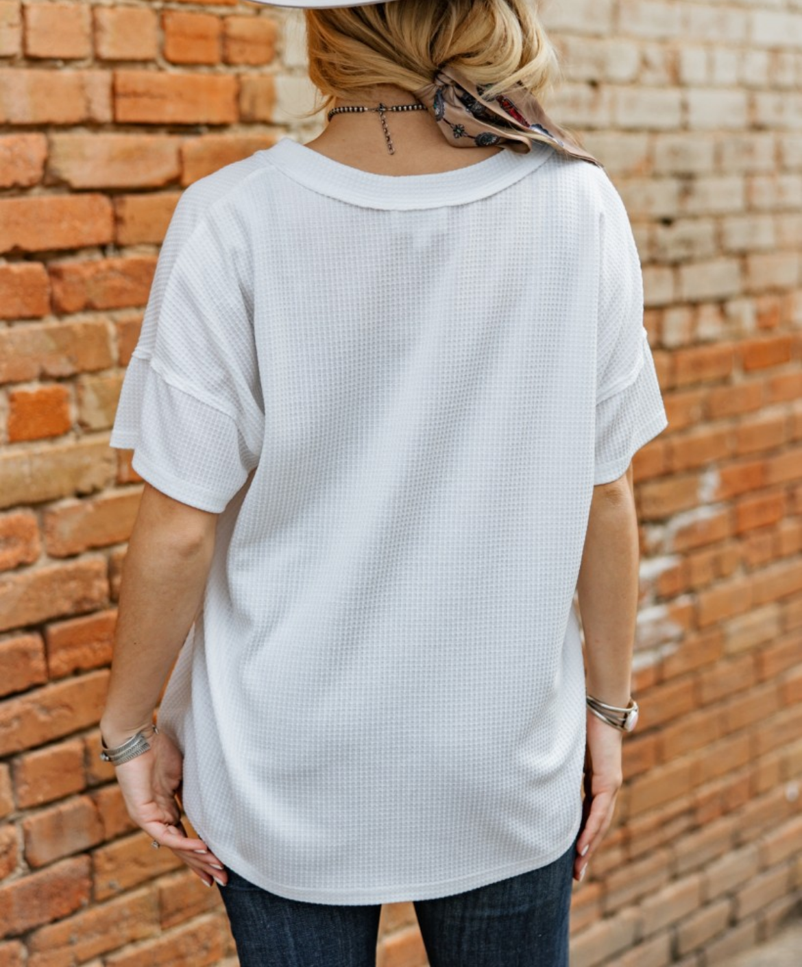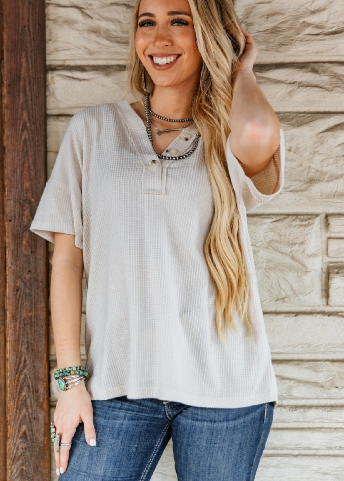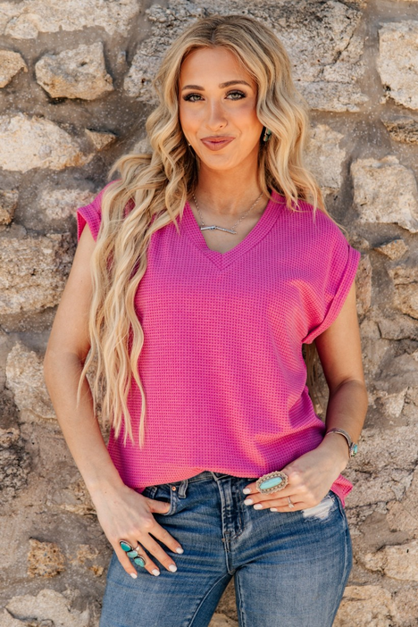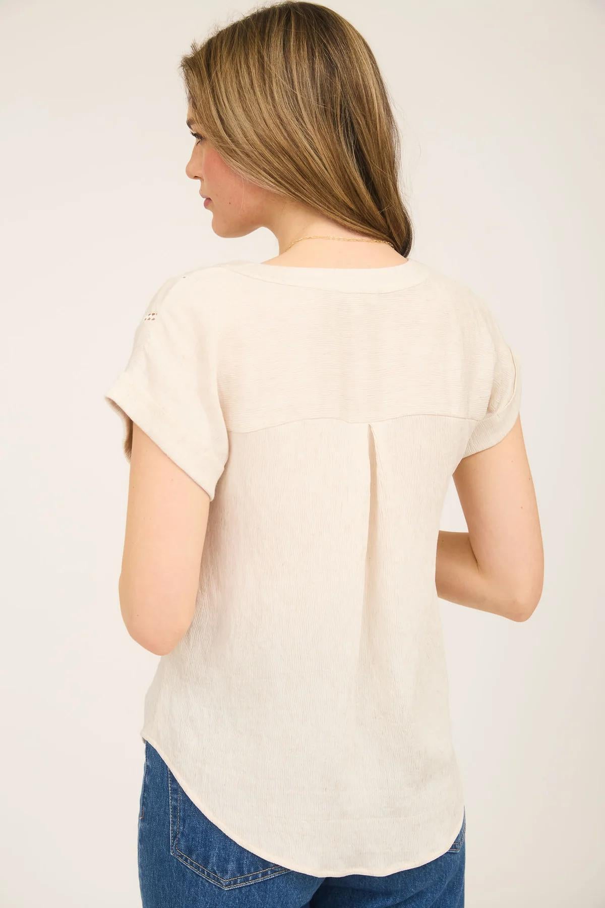 V-Neck Button Waffle Short Sleeve Top