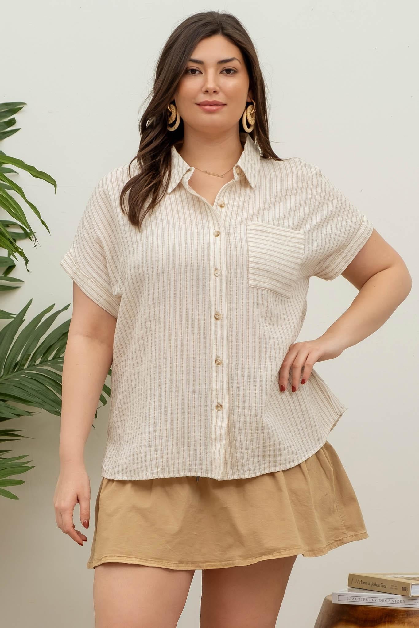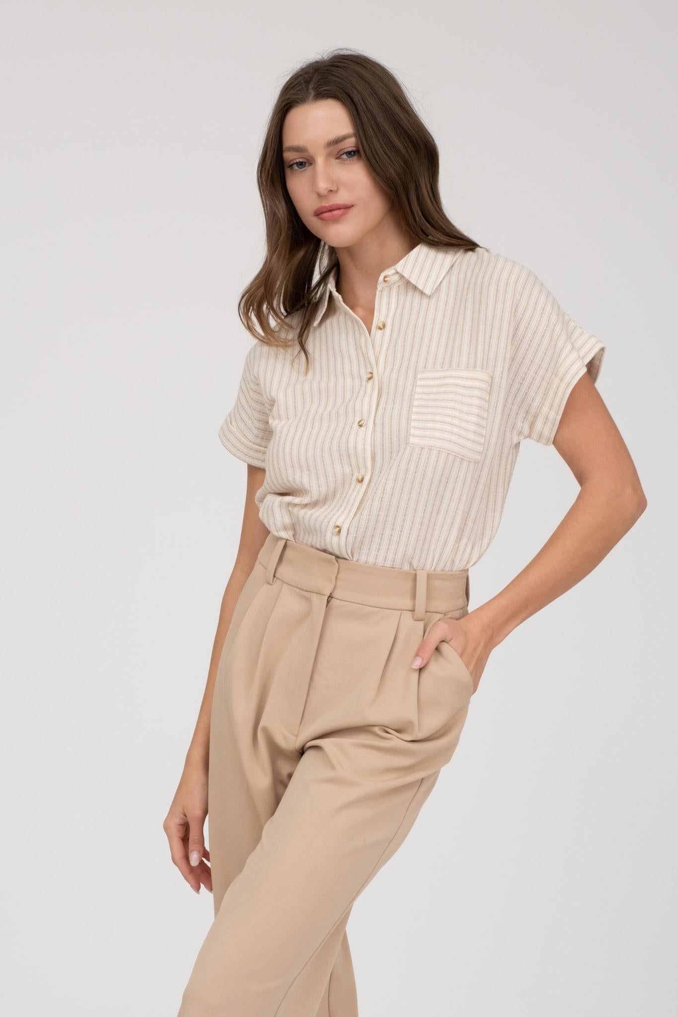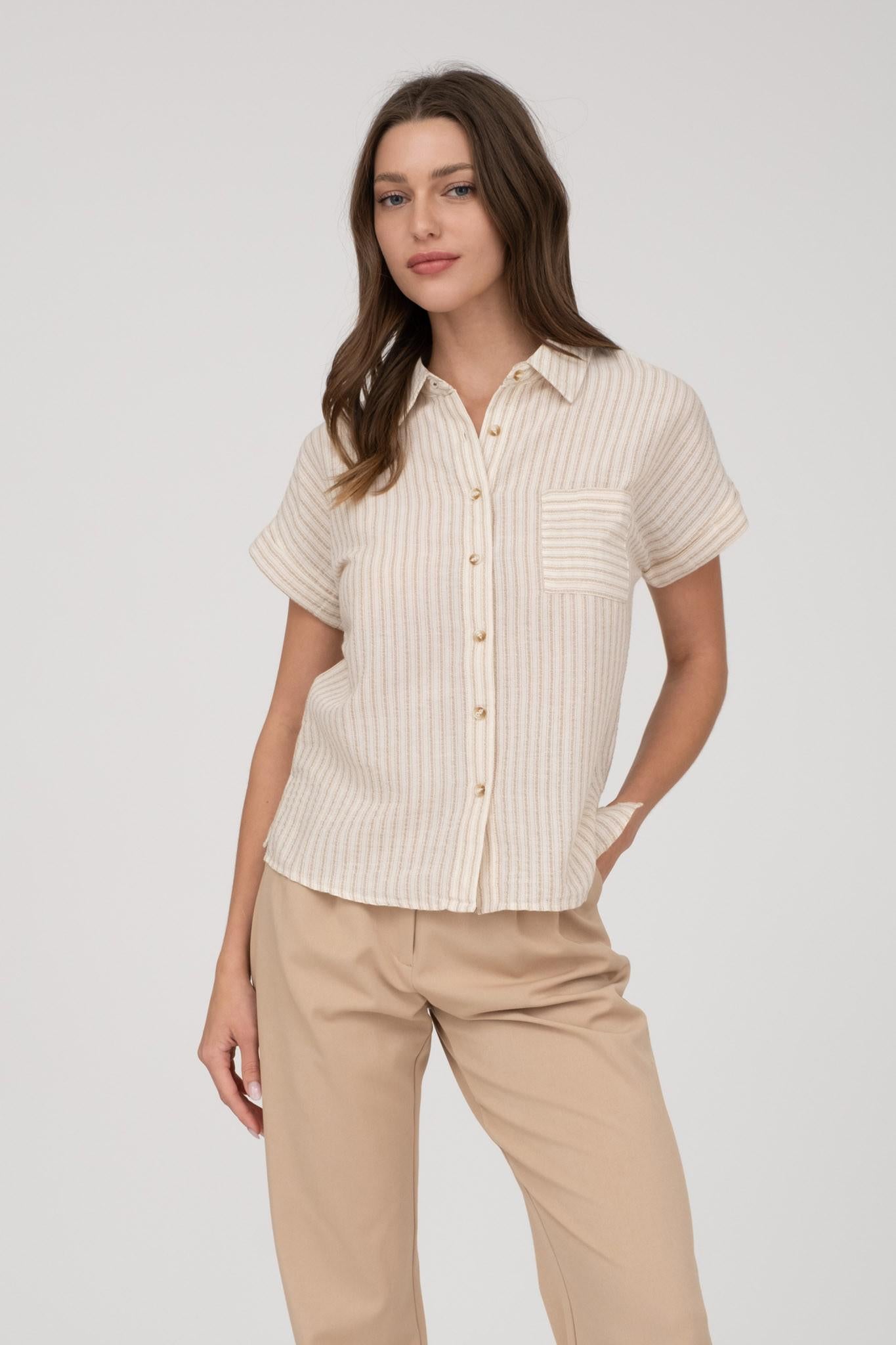 Striped Collared Short Sleeve Linen Shirt