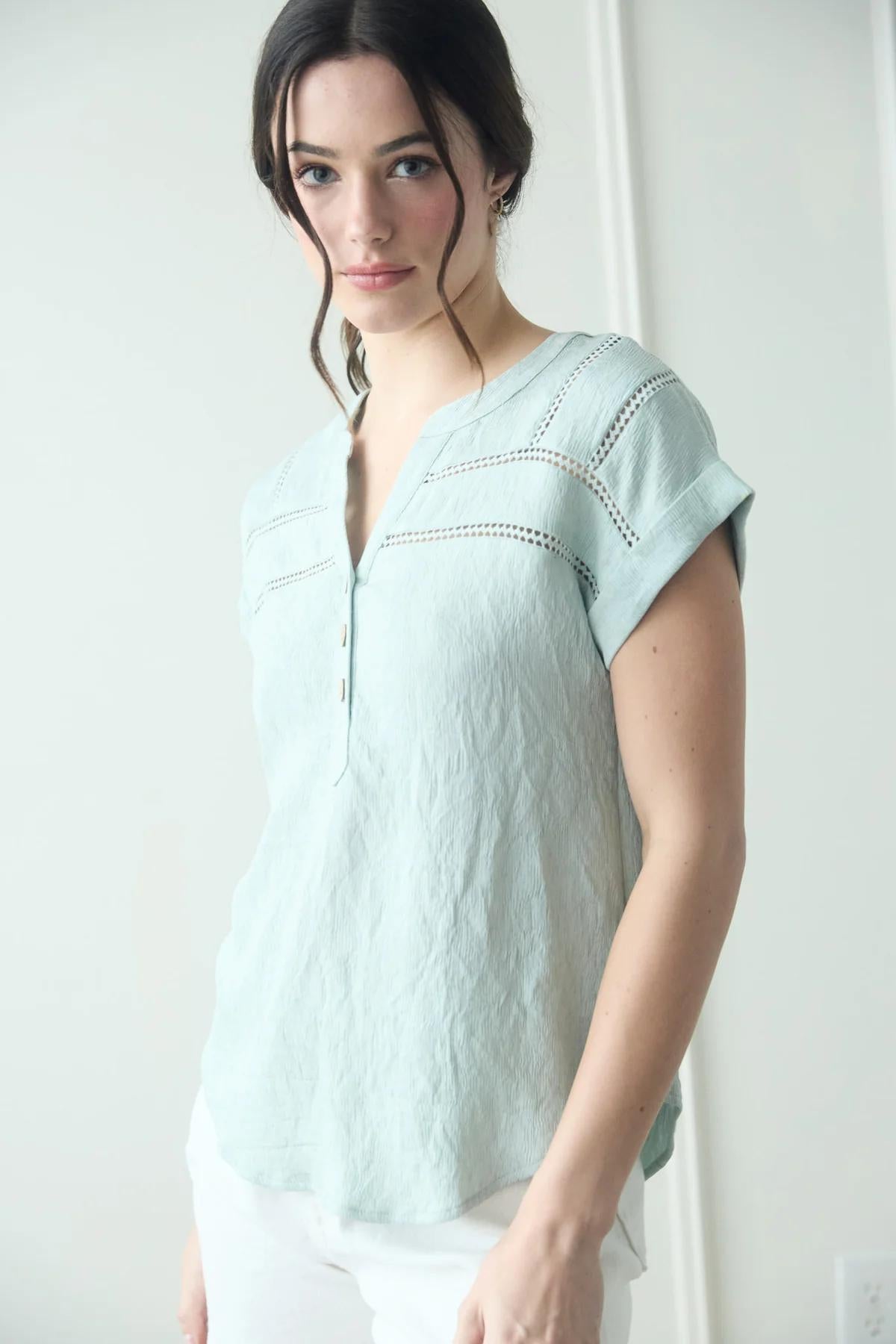 Crochet Lace Trim Short Sleeve Henley Blouse