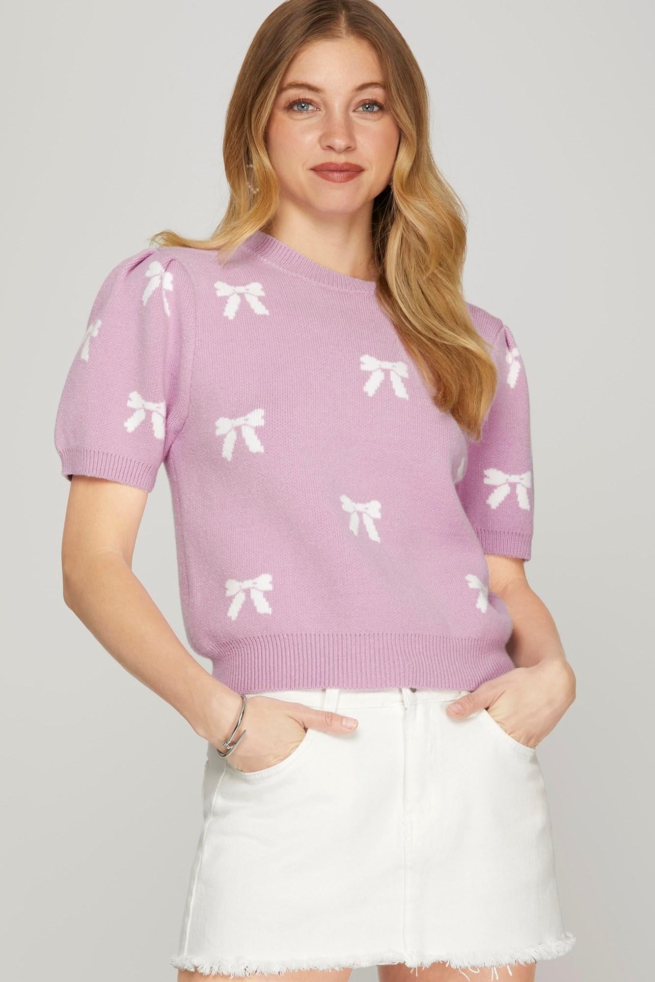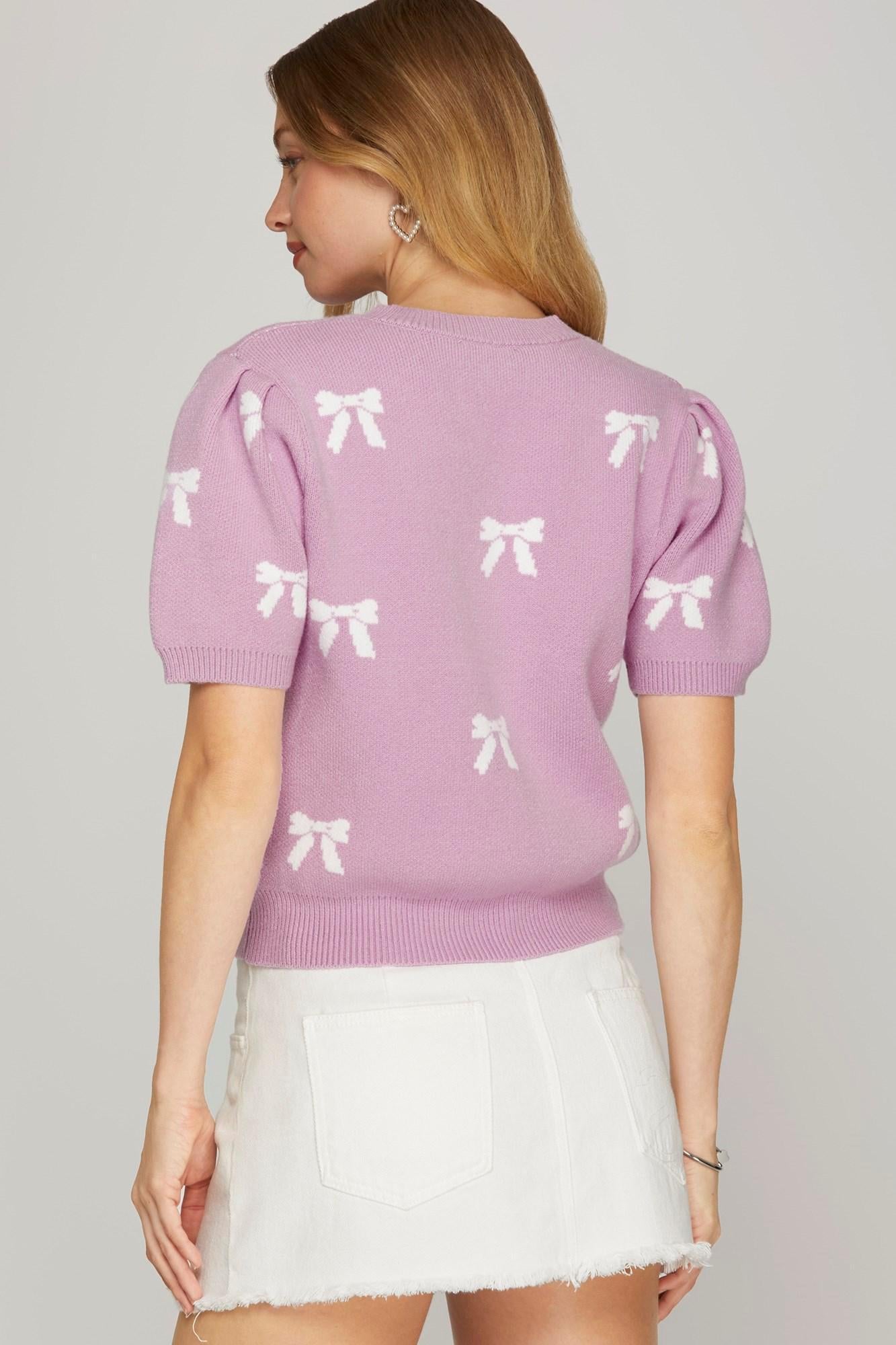 Puff Short Sleeve Bow Pattern Sweater Top