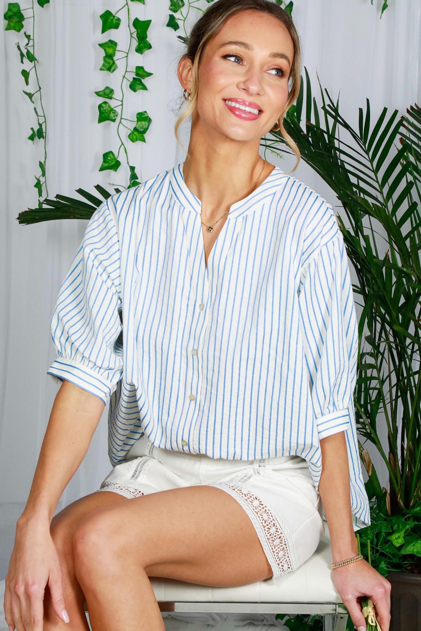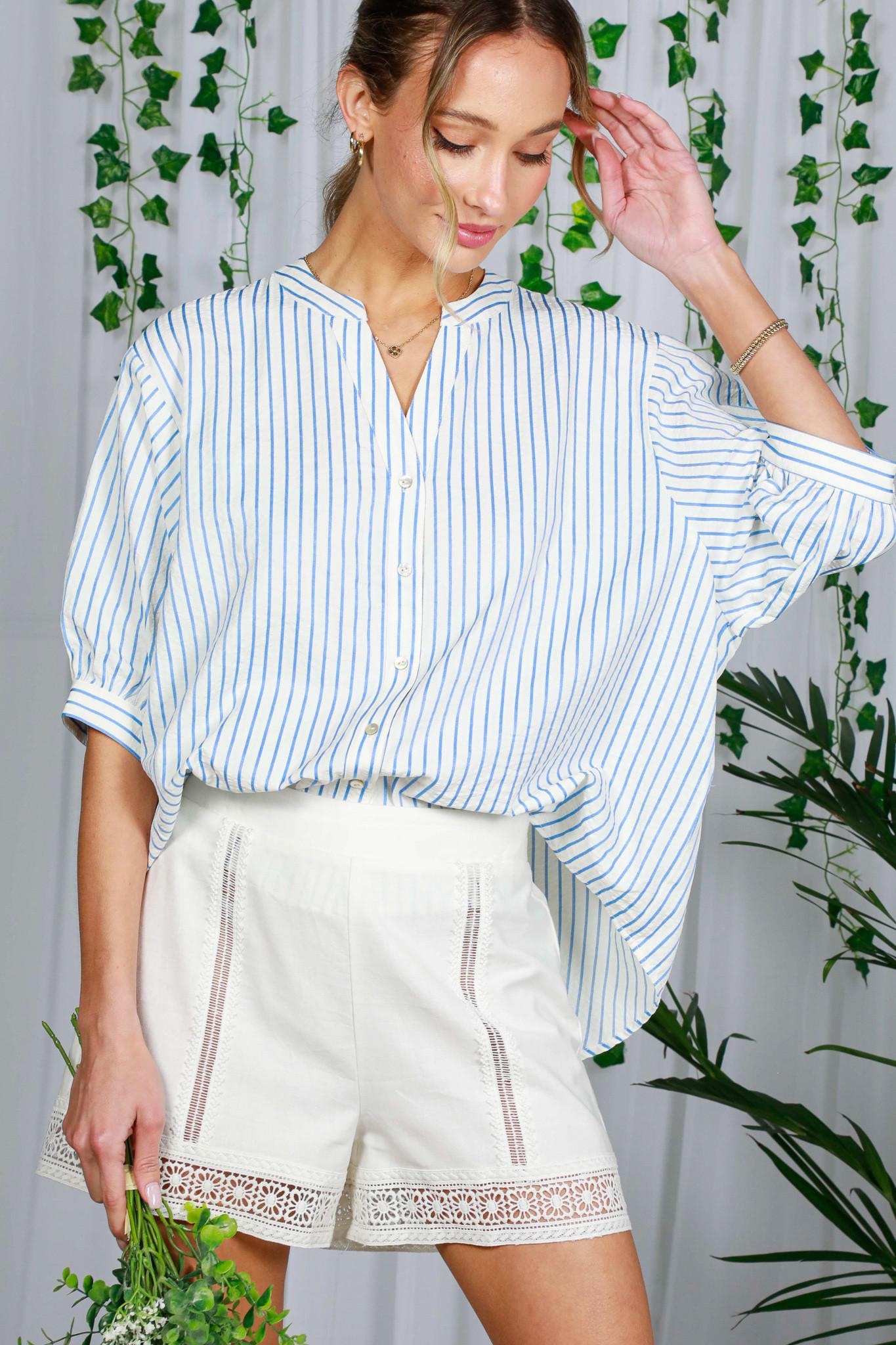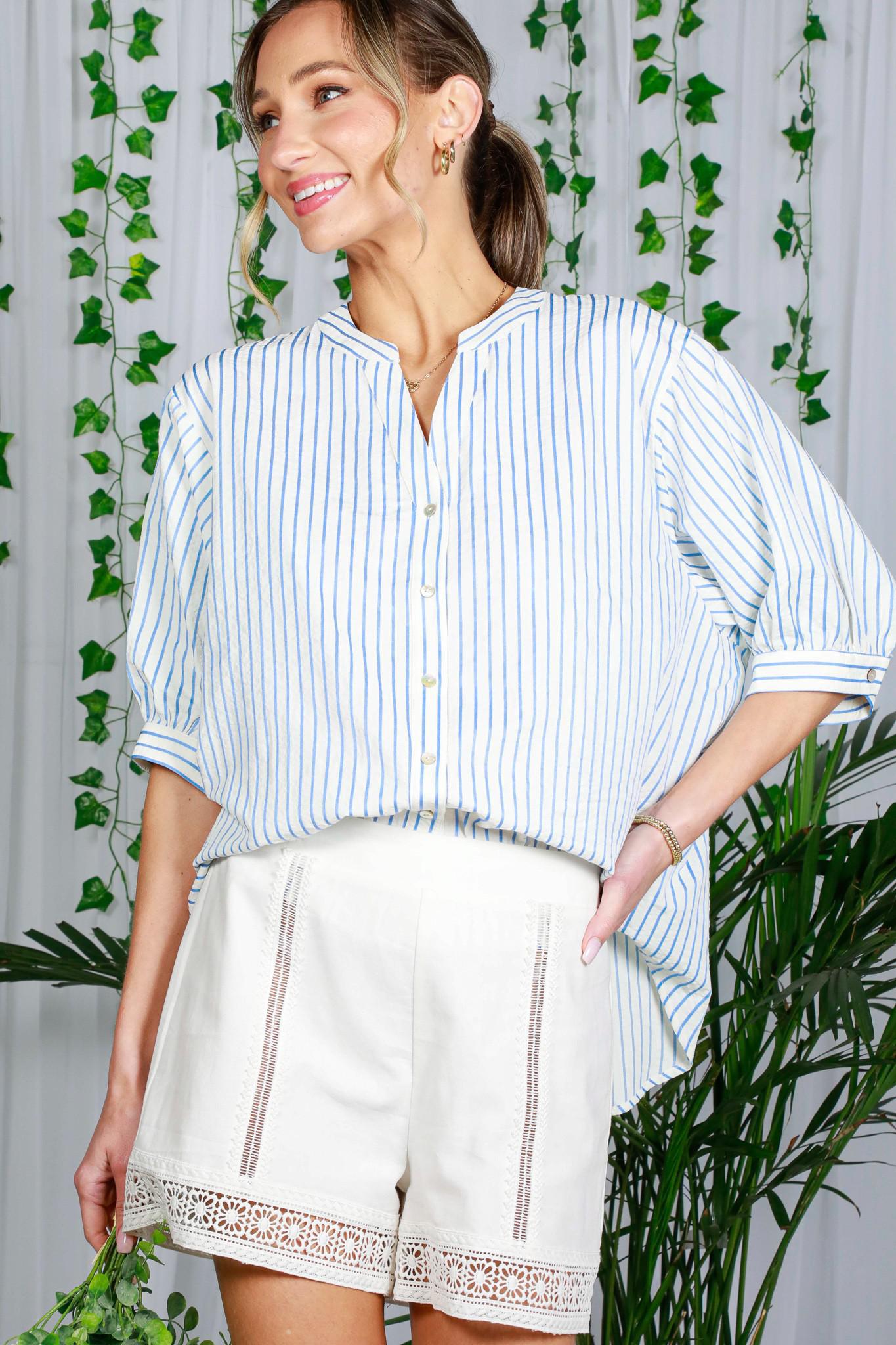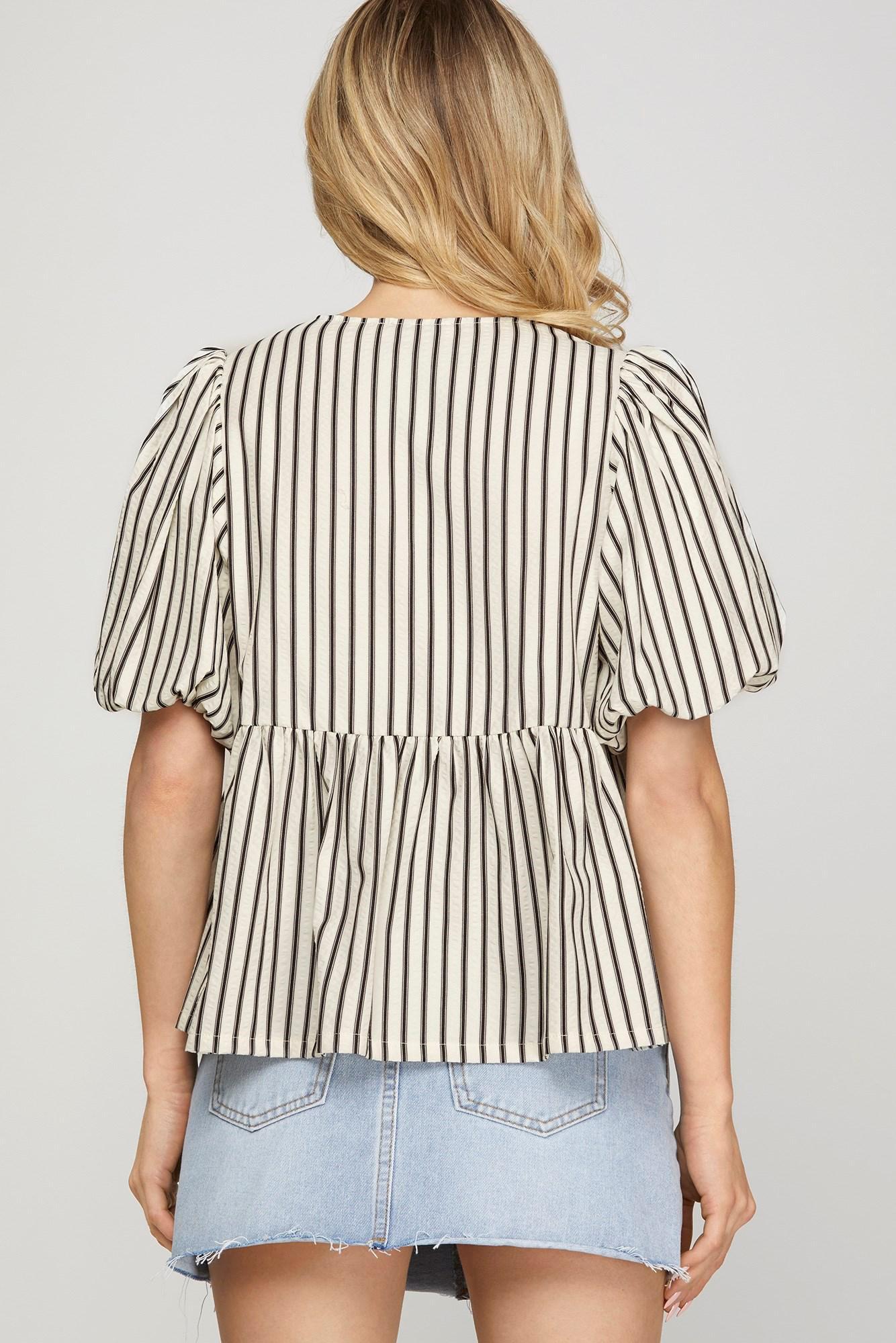 V-neck Puff Short Sleeve Button Down Striped Top