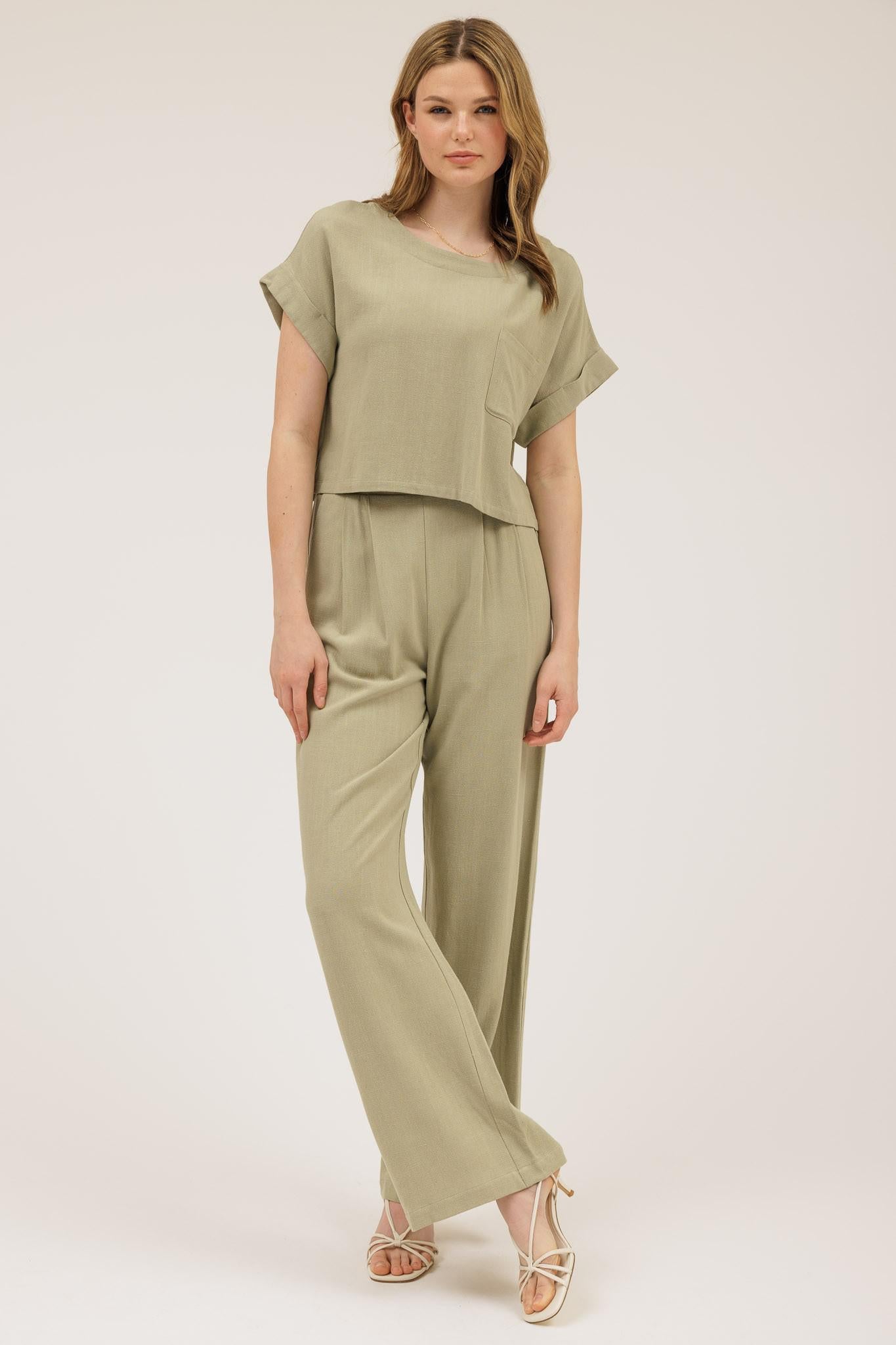 Boat Neck Short Fold Sleeve Boxy Cut Top