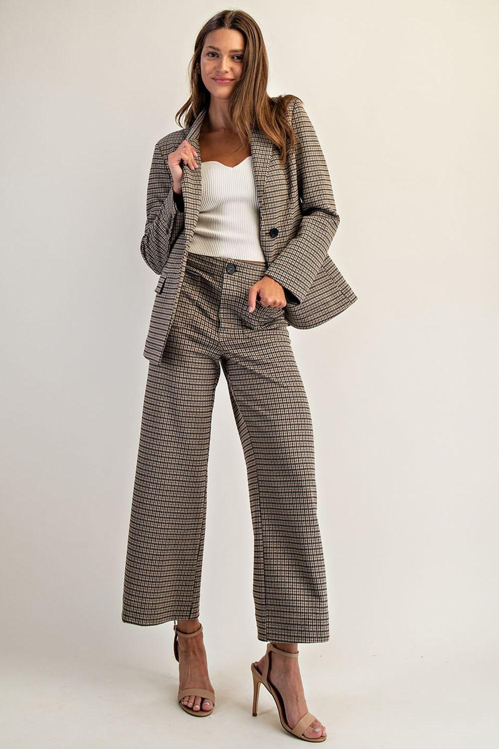 Tailored meets modern comfort. These houndstooth straight-leg pants feature subtle front seam detailing, patch pockets, and a flattering high waist with a button-zip closure. The structured yet flexible fabric makes them perfect for workdays, weekends, and everything in between. Pair them with a crisp blouse, cozy sweater, or complete the set with the matching blazer.