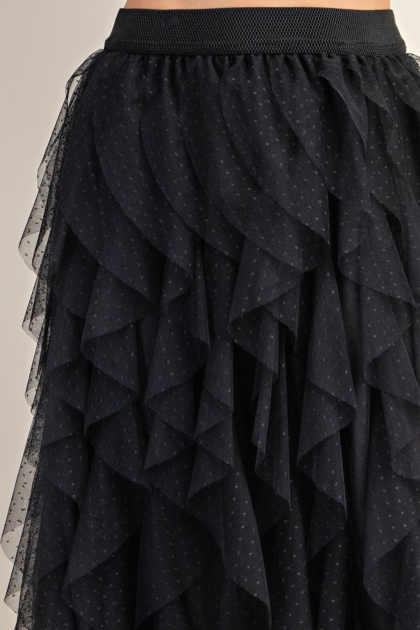 This midi skirt features a waterfall of tulle ruffles and delicate, swiss dot embellishments.