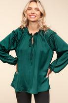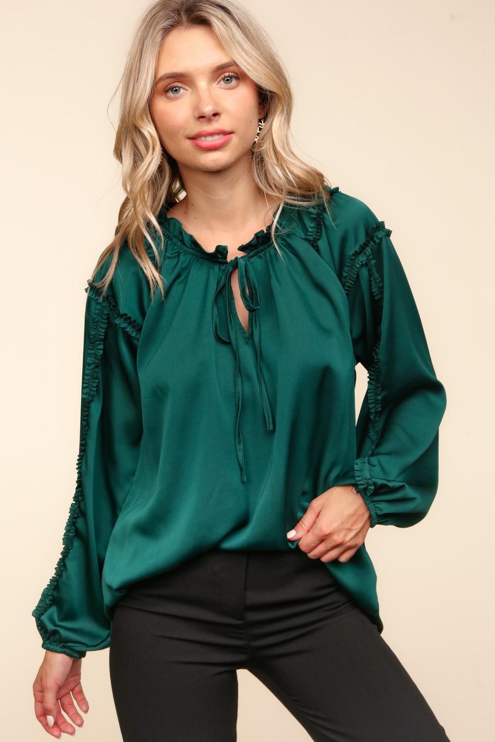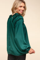 FRILLED MOCK NECK WITH STRAP RAGLAN LONG SLEEVE WITH RUFFLE SOLID SATIN WOVEN BLOUSE TOP