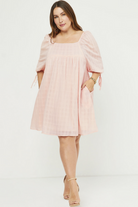 Textured Solid Checkered Tie Sleeve Square Neck Dress