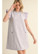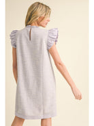 Tweed shift dress with frilled neck, back key hole, front pockets, flutter sleeves finished with Tone-on-tone solid trimming edge.