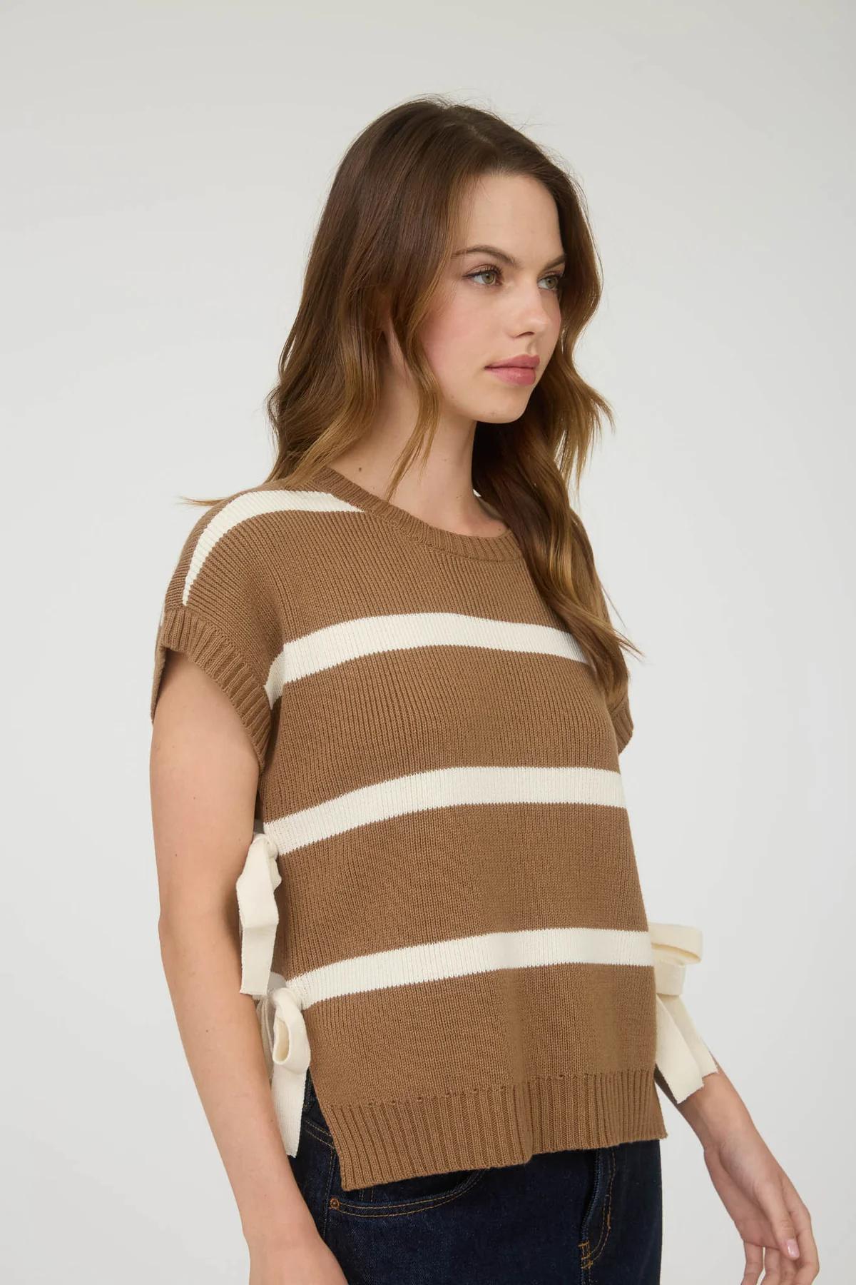 Effortless layering meets playful detail in this stripe knit sweater vest with side tie accents. Designed with a classic round neckline, relaxed fit, and drop shoulder silhouette, this short sleeve pullover is as versatile as it is stylish. The bold stripe pattern adds a modern touch, while the bow-tie sides bring in a feminine, on-trend twist. Made with a soft cotton-acrylic blend, it offers breathable comfort for transitional weather—perfect for fall layering or spring refresh looks.