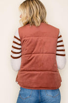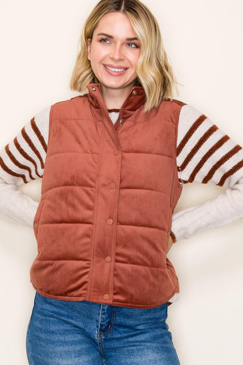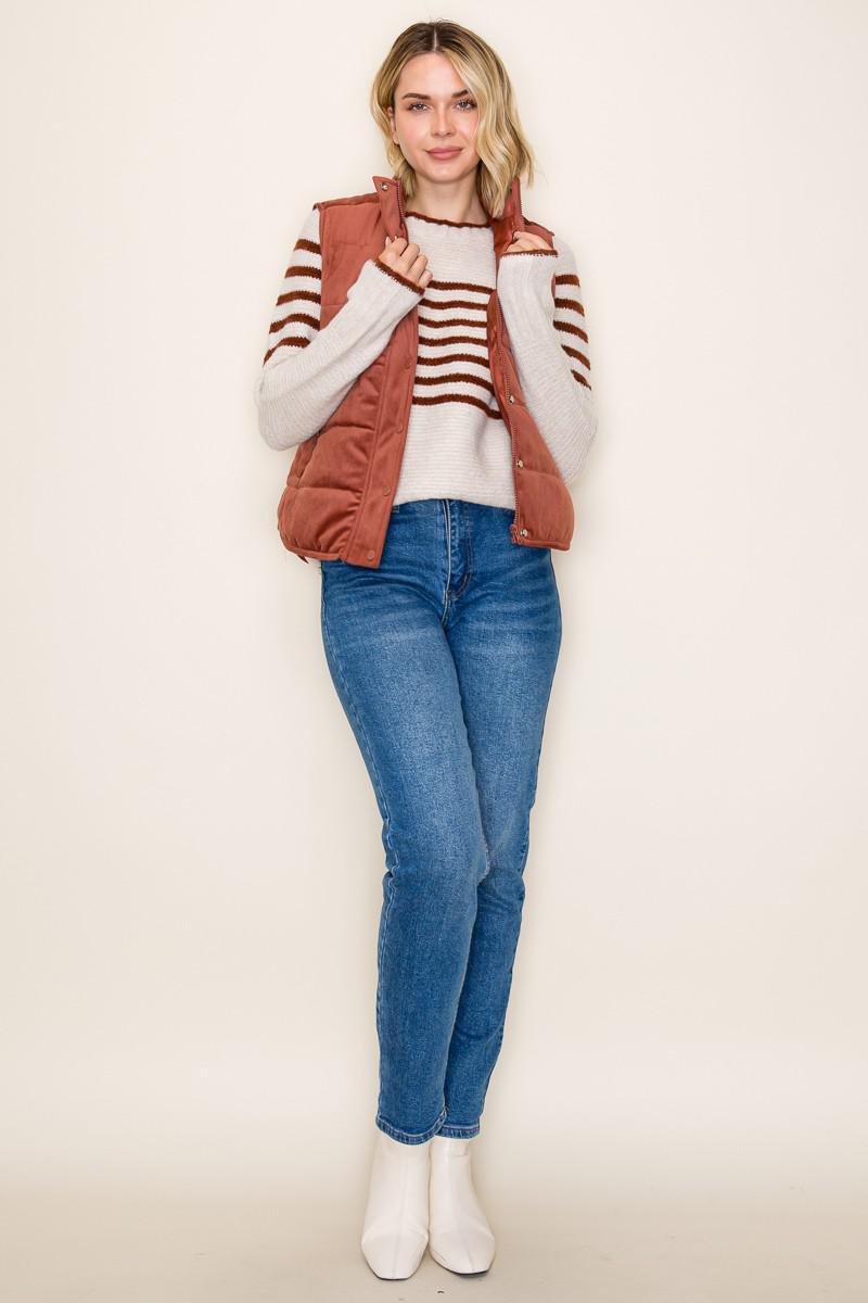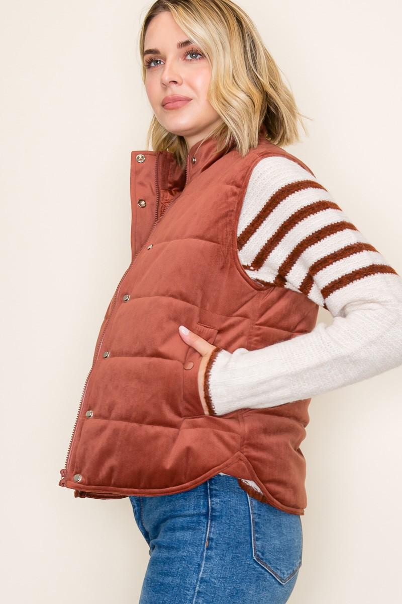 Your new fall layering MVP has arrived. This quilted corduroy puffer vest in a rich terracotta hue is as practical as it is stylish. With a hidden zip and snap button closure, cozy pockets, and a polished stand collar, it’s the perfect grab-and-go piece when the weather turns crisp. The soft corduroy finish gives it that extra seasonal touch you’ll reach for again and again.