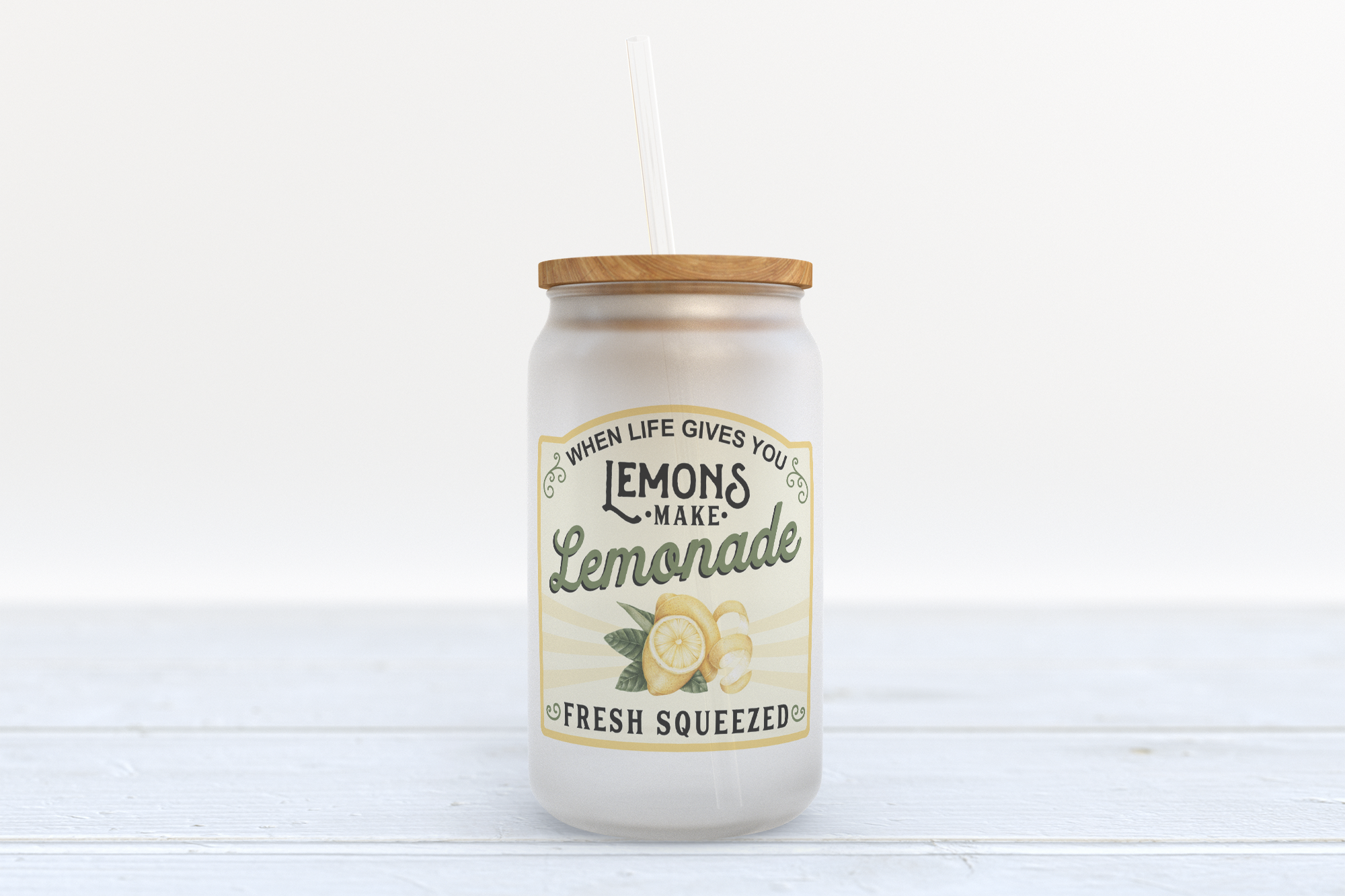 This Libbey glass can is 16 ounces, and comes with a bamboo lid and plastic straw. It is available is clear or frosted glass.