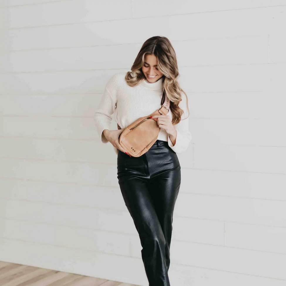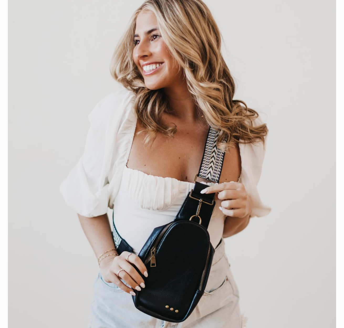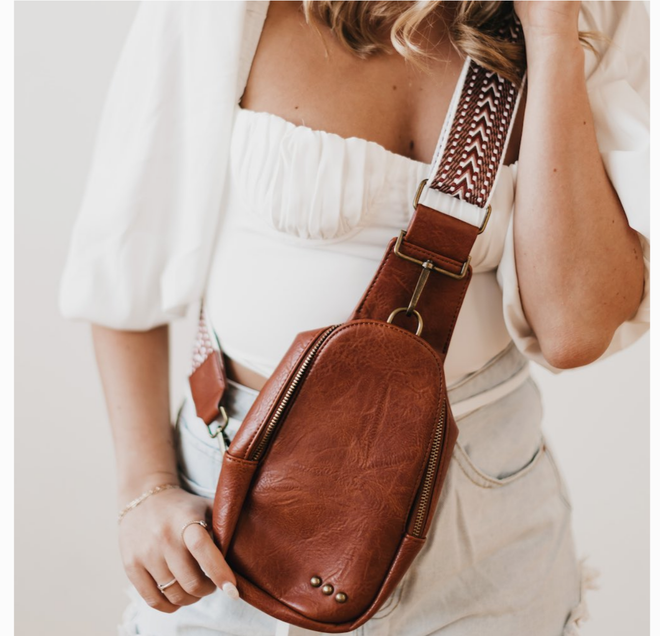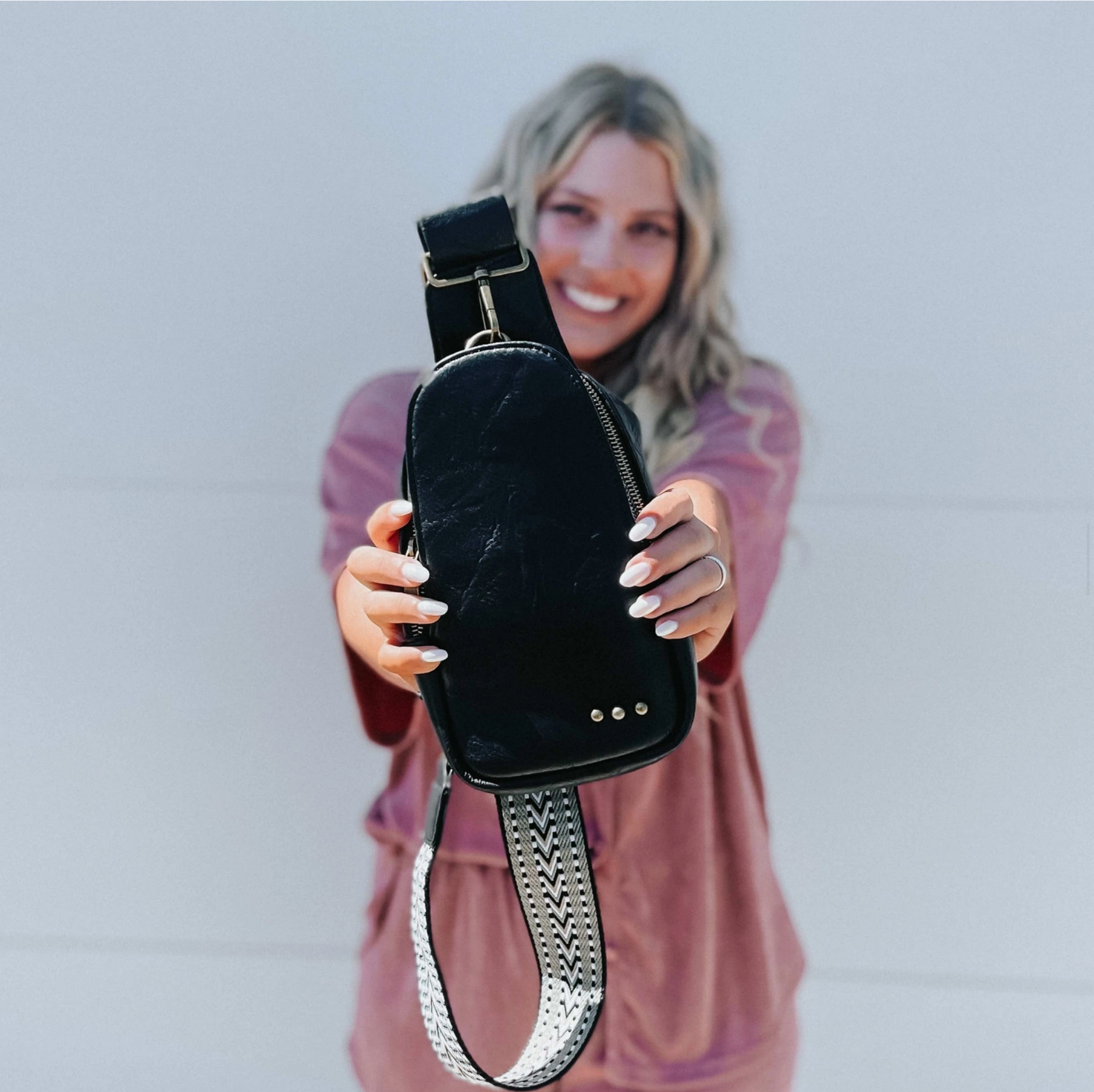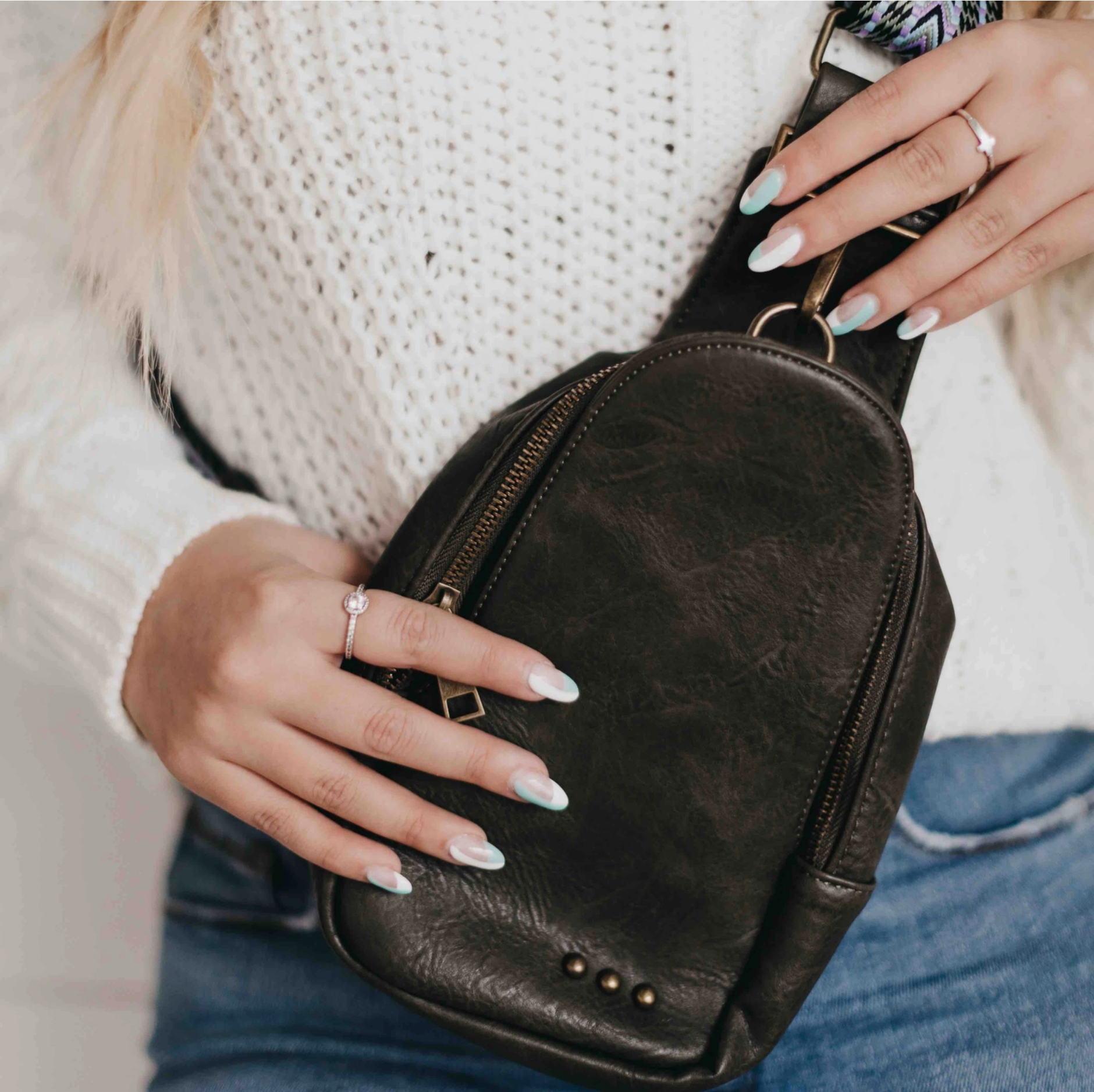 The Jordan Sling Bag is a true show stopper! This vegan leather bag has a woven geometric guitar style strap and two pockets for storage. The large pocket has both a hook and zipper closure and the other has a magnetic snap closure that leads to a place to store your cards/cash! Can it get any better than that?