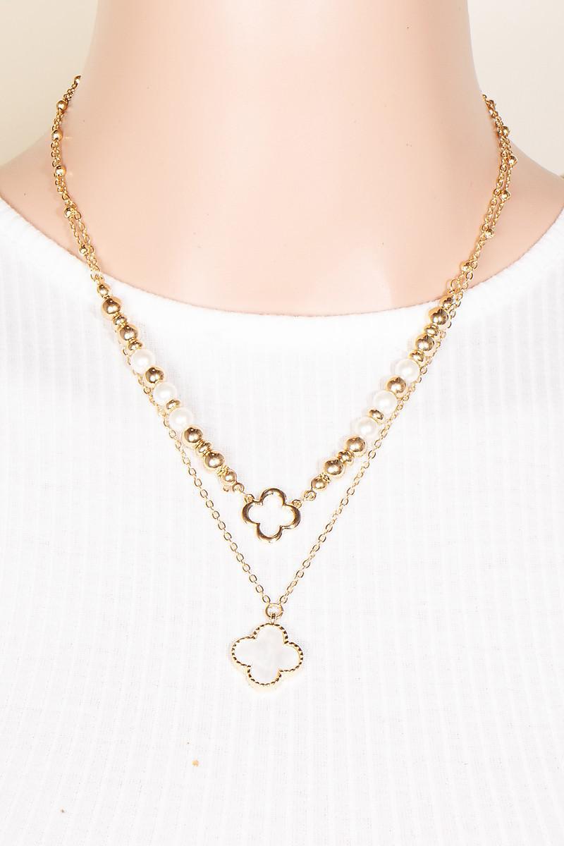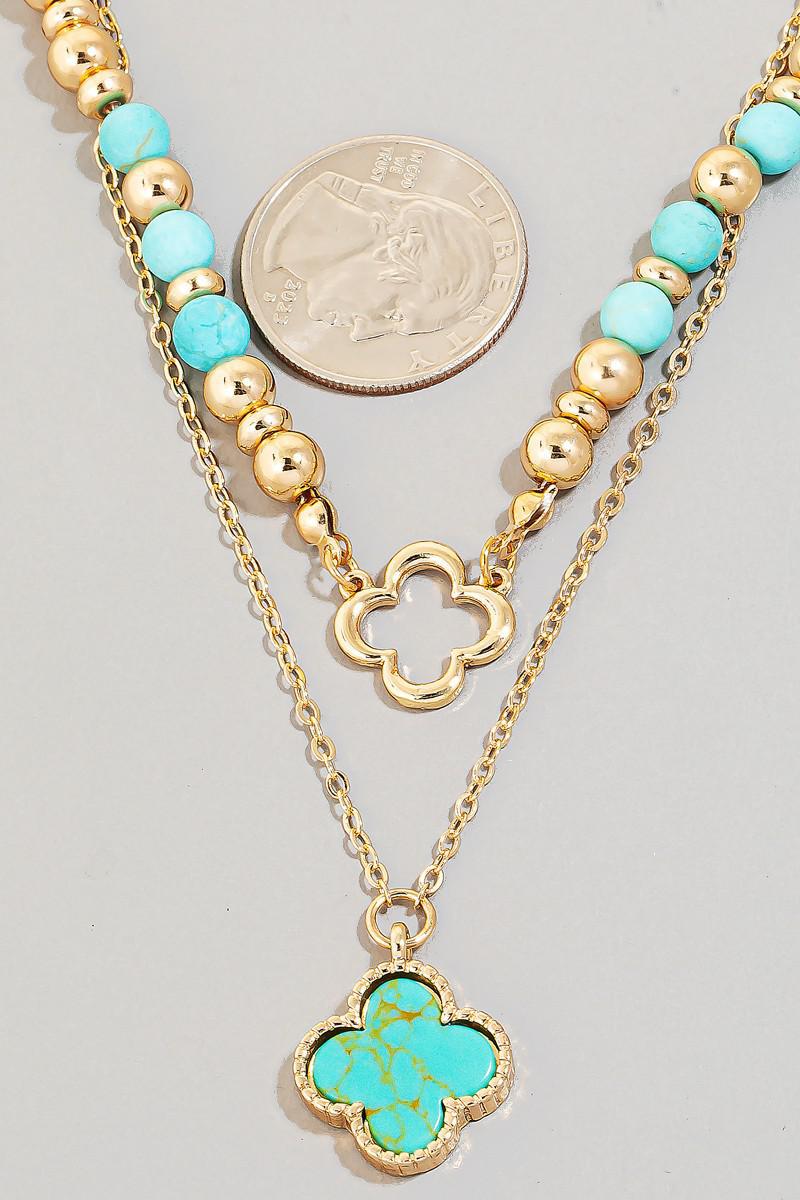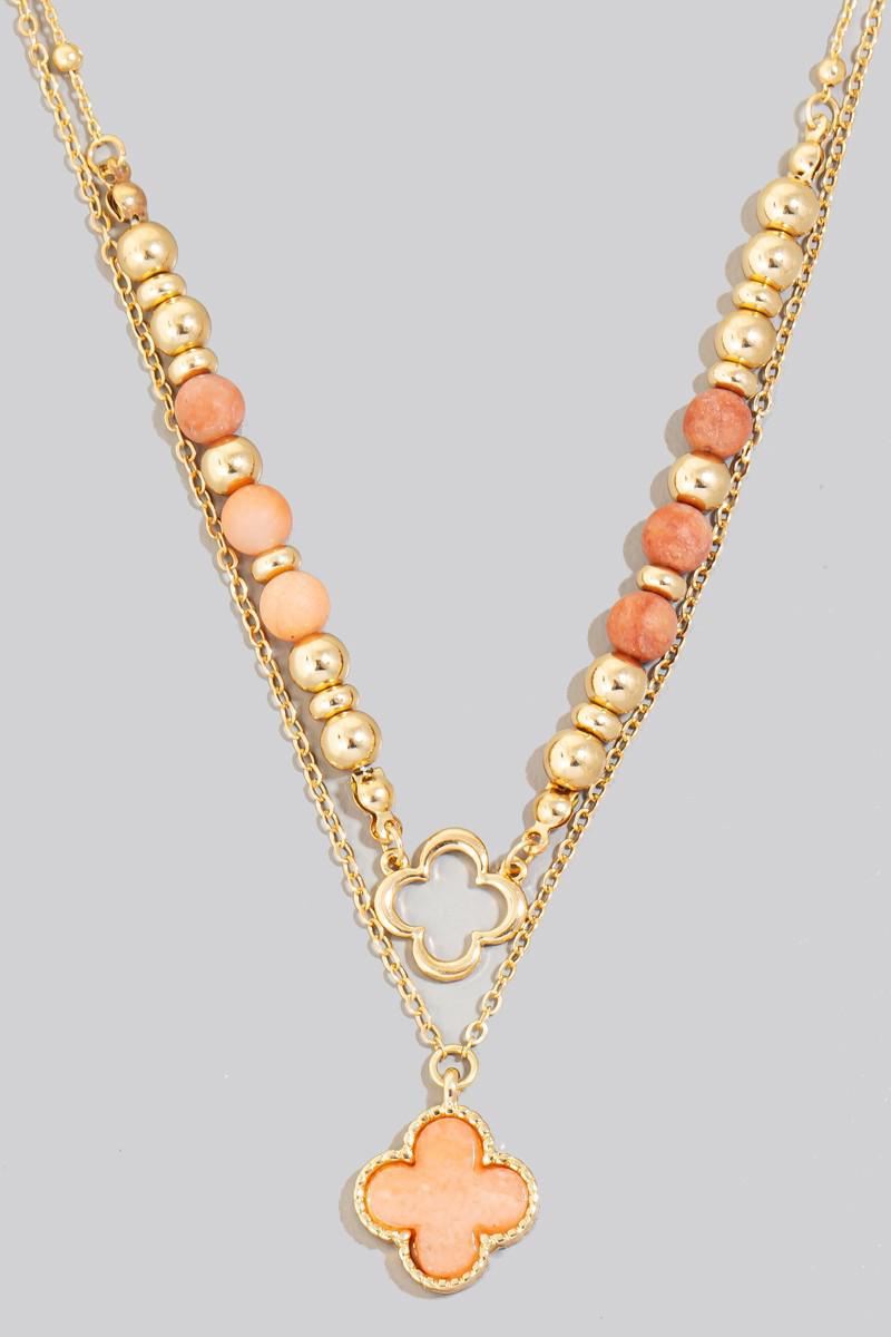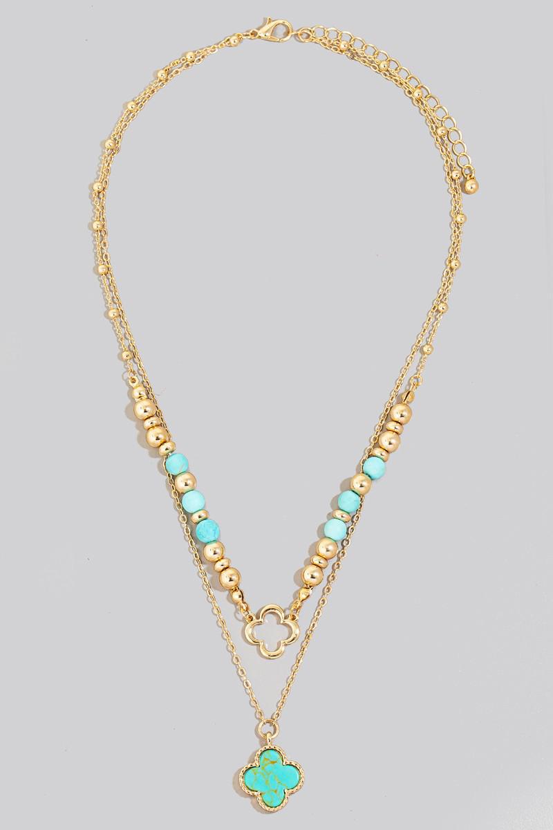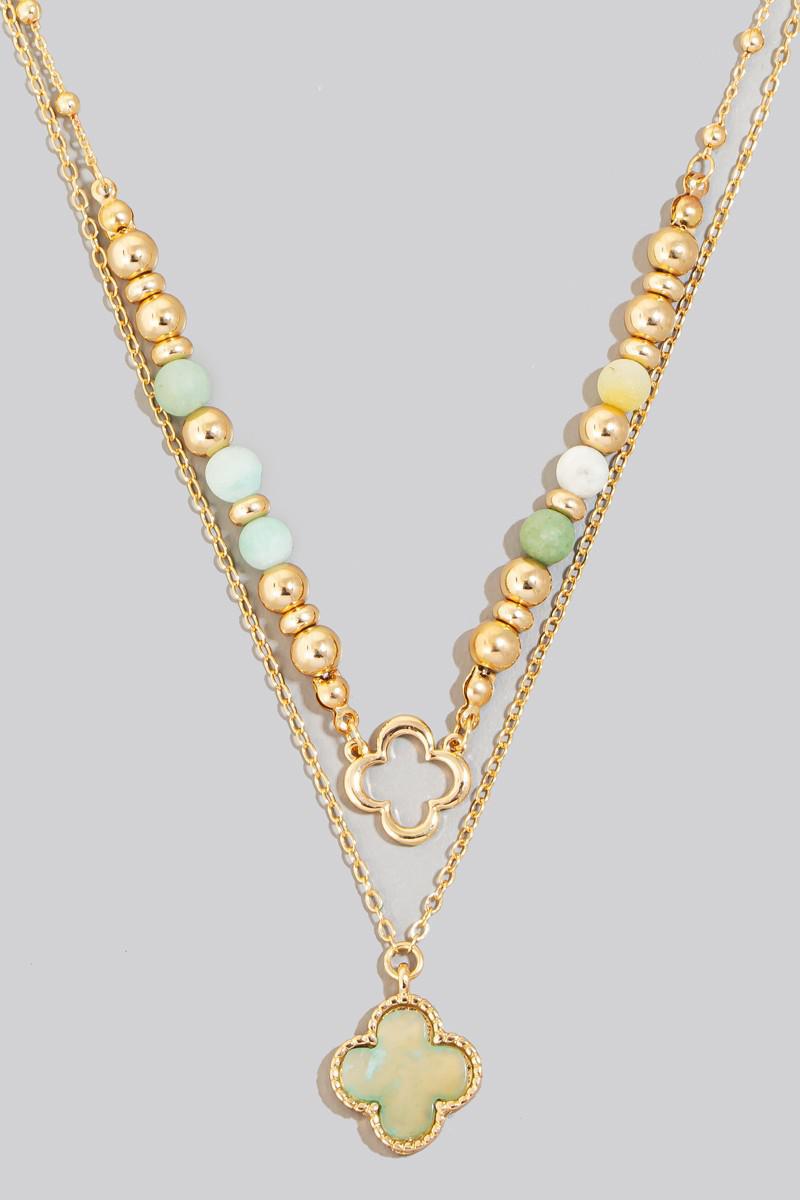 Stone Clover Pendant Layered Beaded Chain Necklace