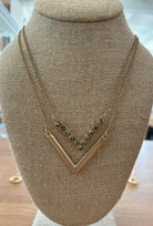 This layered necklace features a bold gold V-bar paired with a row of dalmatian jasper beads in neutral black and tan tones. The geometric design makes it modern, while the natural stone adds a unique, earthy touch.