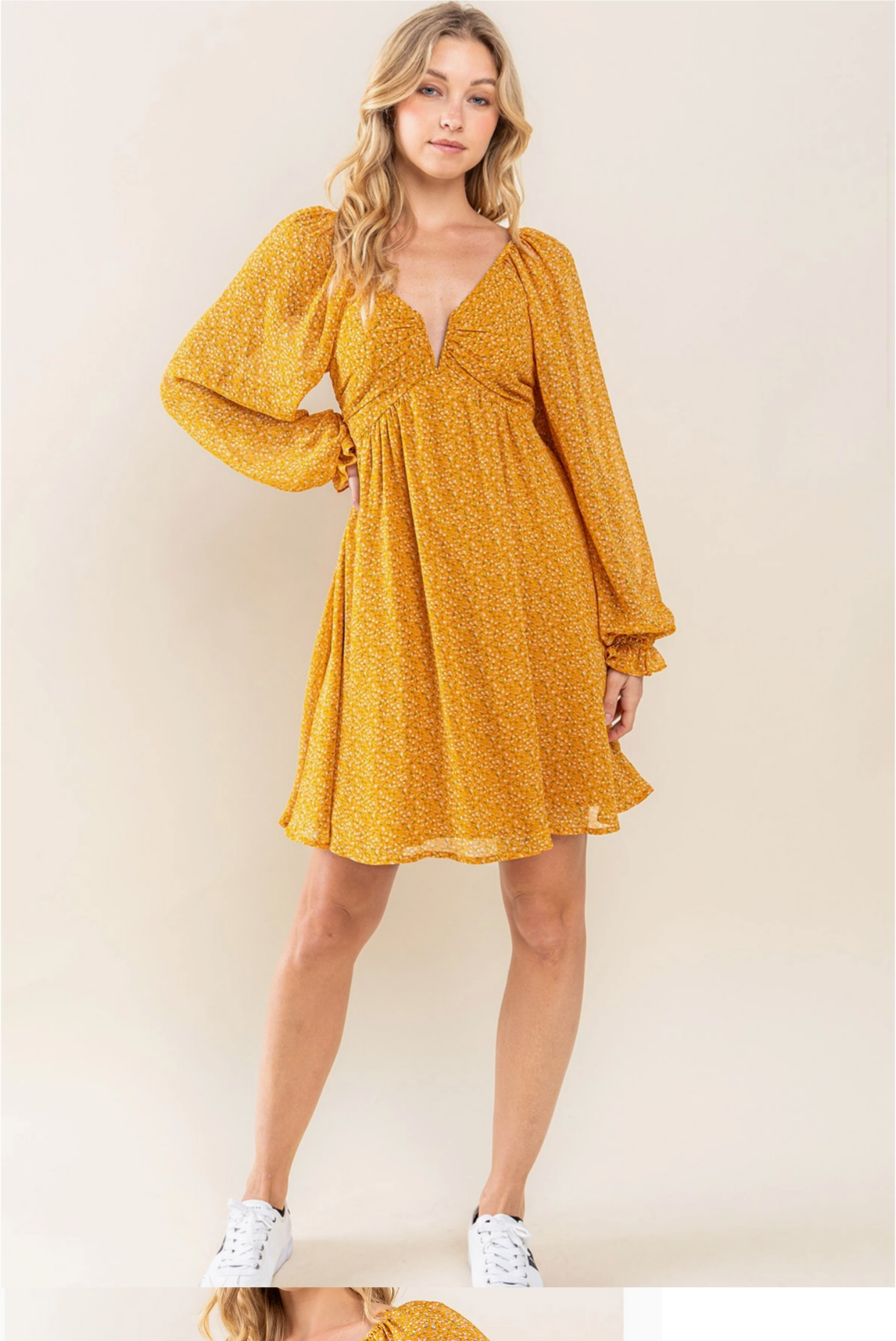 Sweetheart, split neck floral chiffon flare dress with open back, baloon sleeves and lining.