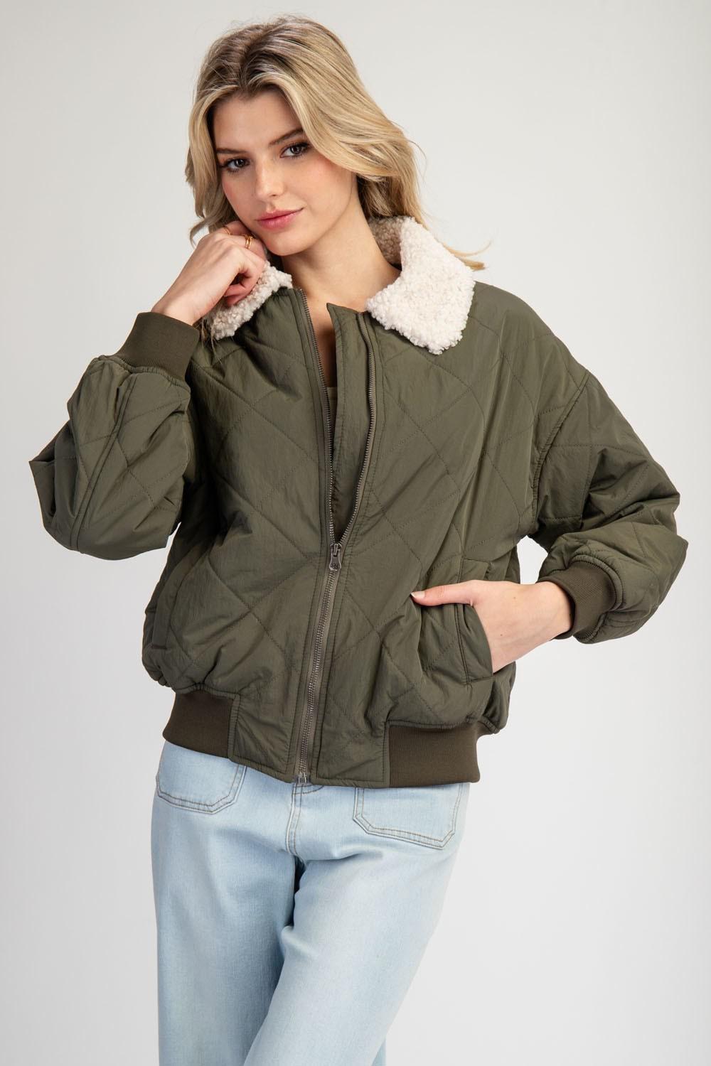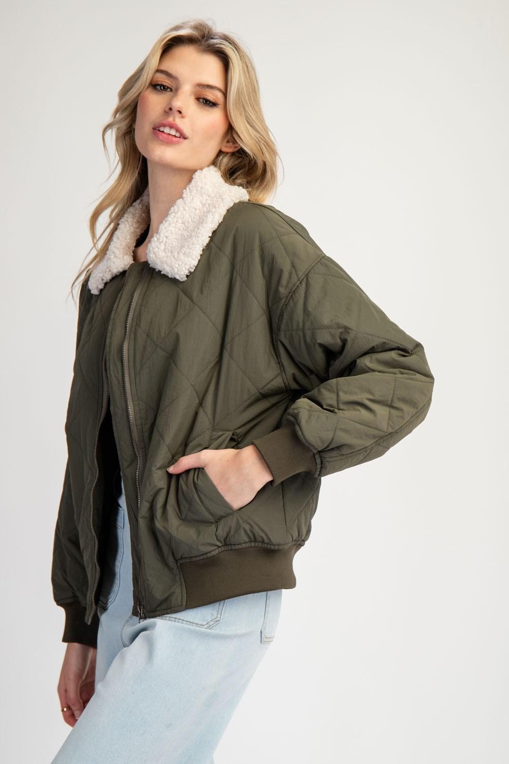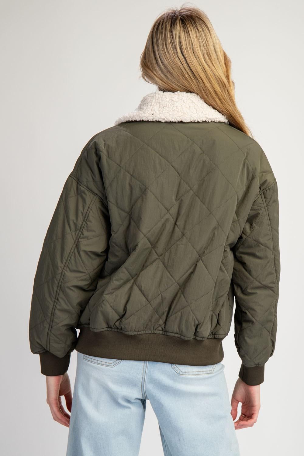 Suede Piping Rib Quilted Padding Jacket - Olive