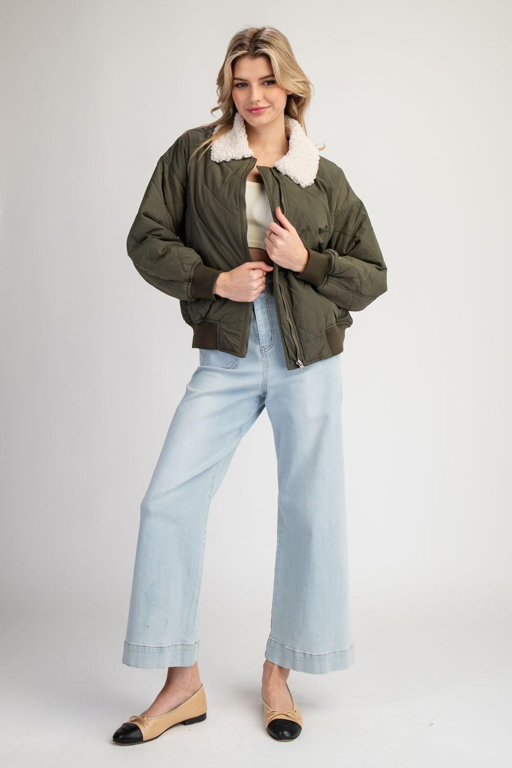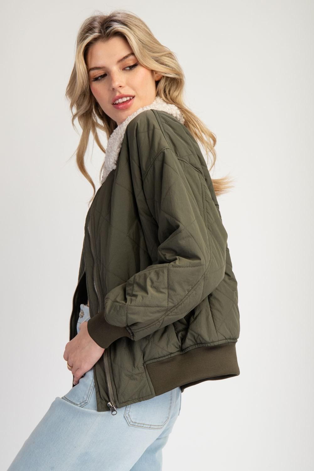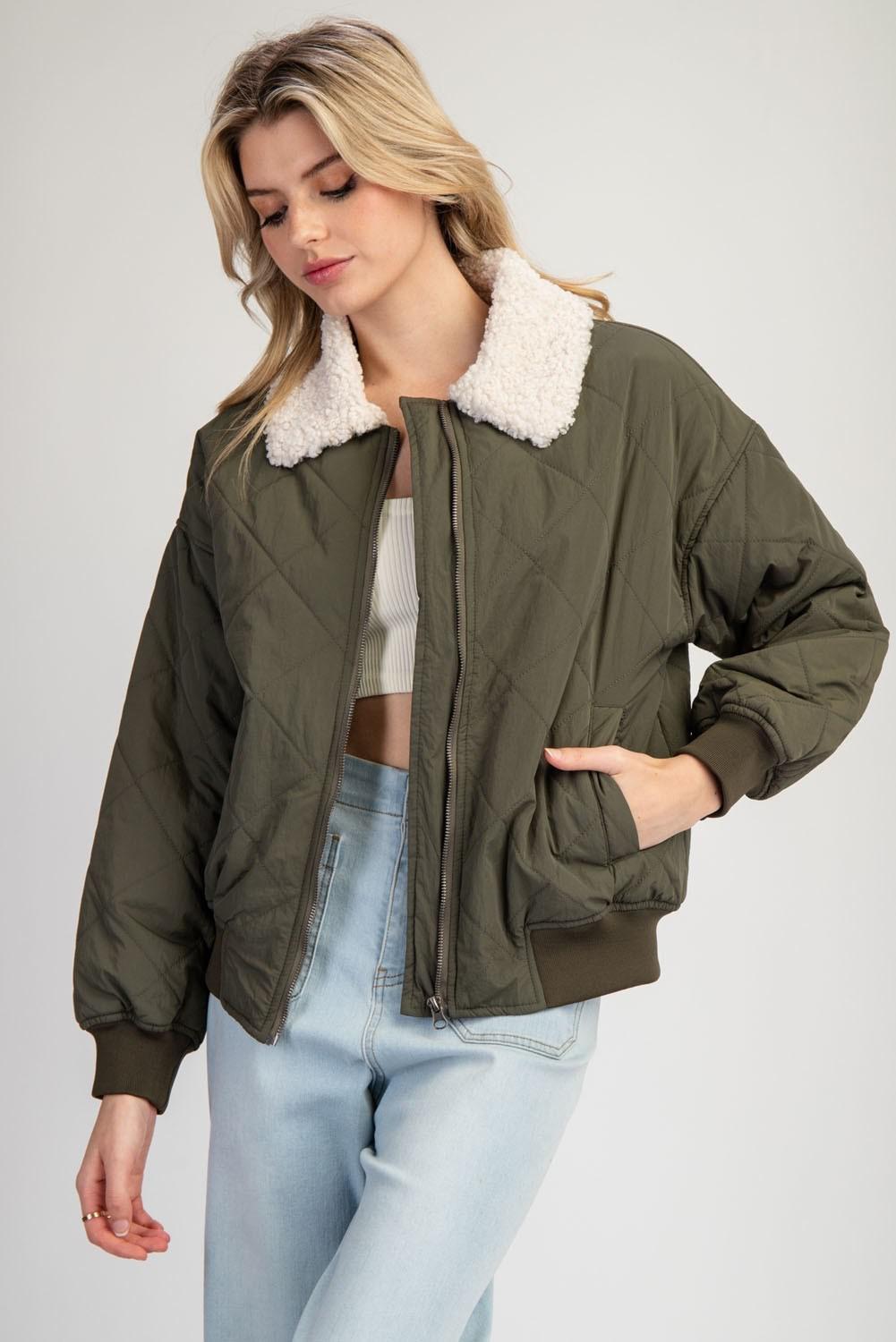 Suede Piping Rib Quilted Padding Jacket - Olive