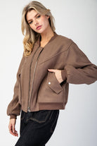 The Coco Classic Bomber Jacket is the perfect balance of cool and cozy. Designed with a zip-front closure, subtle mock neckline, and banded cuffs and hem, this jacket has that effortless street-style vibe with a polished finish. Added seam details and flap pockets bring a touch of structure, while the soft, mid-weight fabric makes it easy to layer all season long. Pair it with jeans for an off-duty look or dress it up over a sleek dress for an unexpected edge.