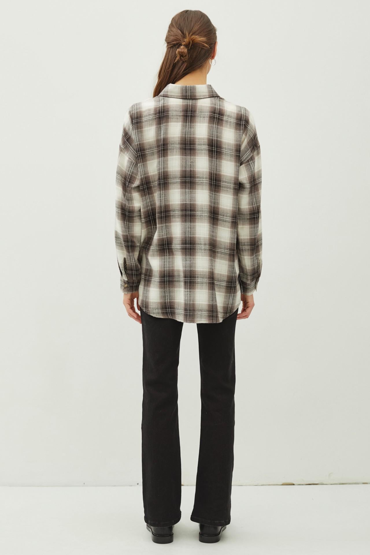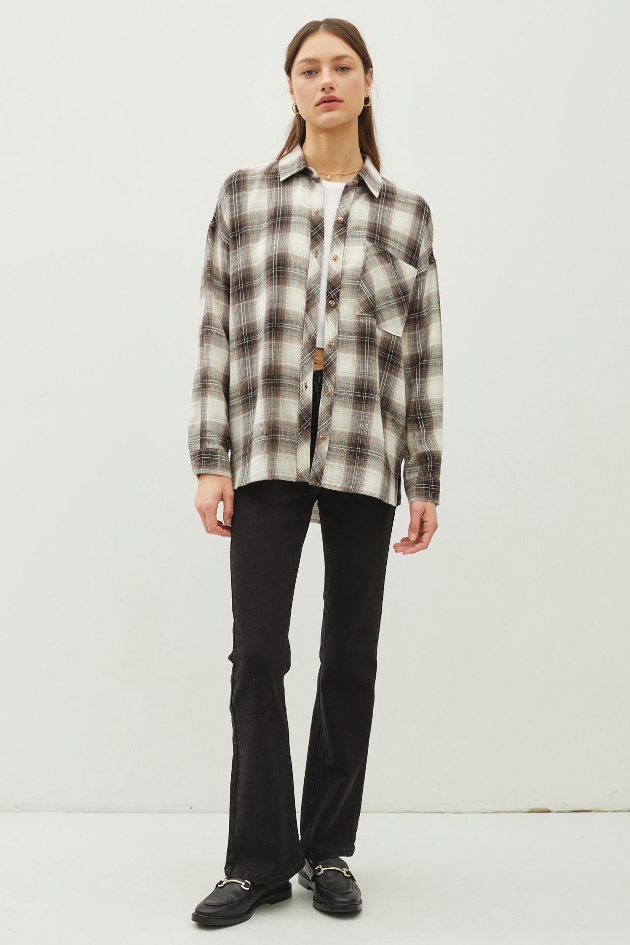This ultra-soft flannel shirt in a moody charcoal and warm brown plaid is your fall and winter layering essential. Designed with a relaxed, oversized fit and made from a cozy poly-rayon blend, it’s perfect for tossing over a tee, styling with leggings, or half-tucking into denim for that effortlessly casual vibe.