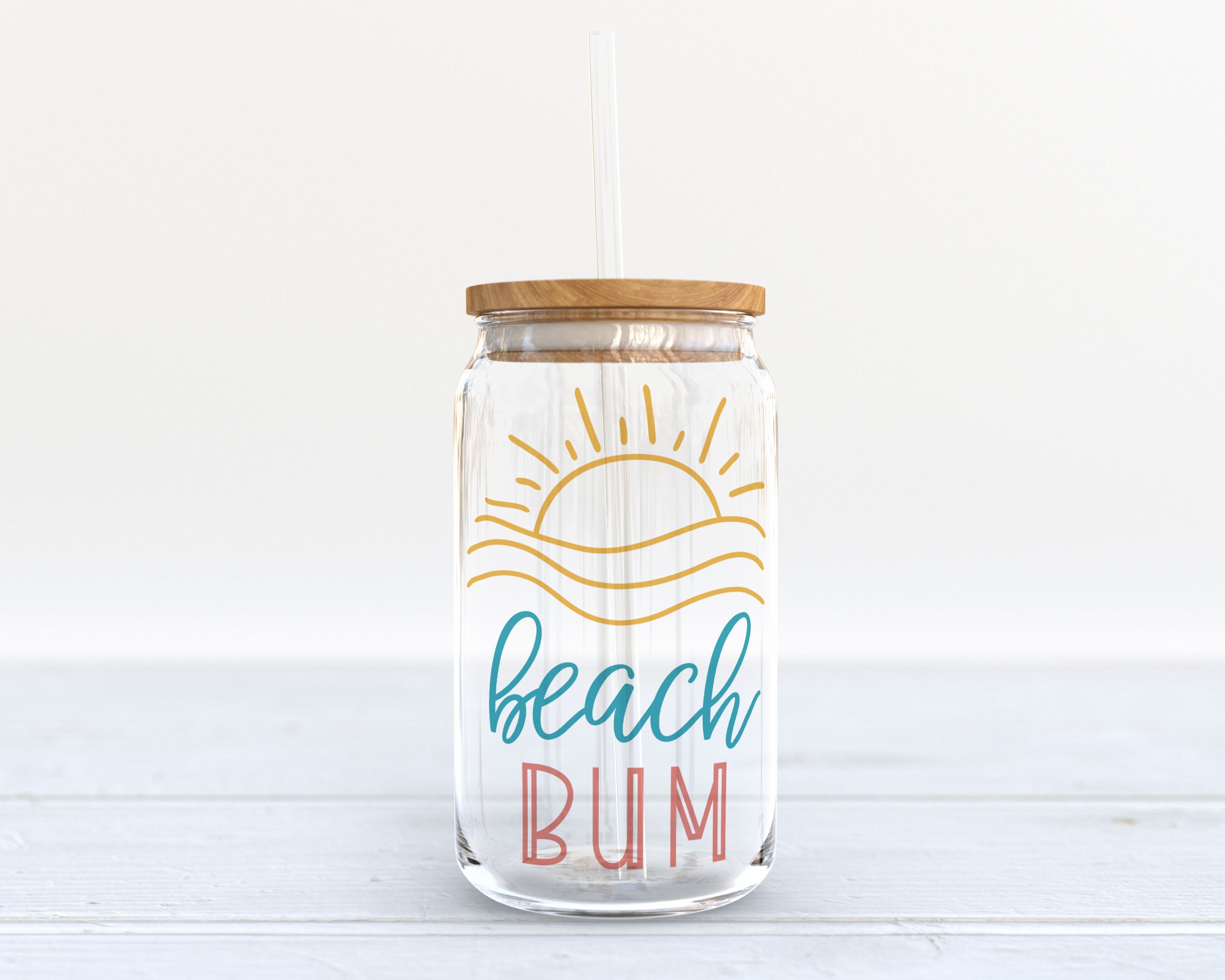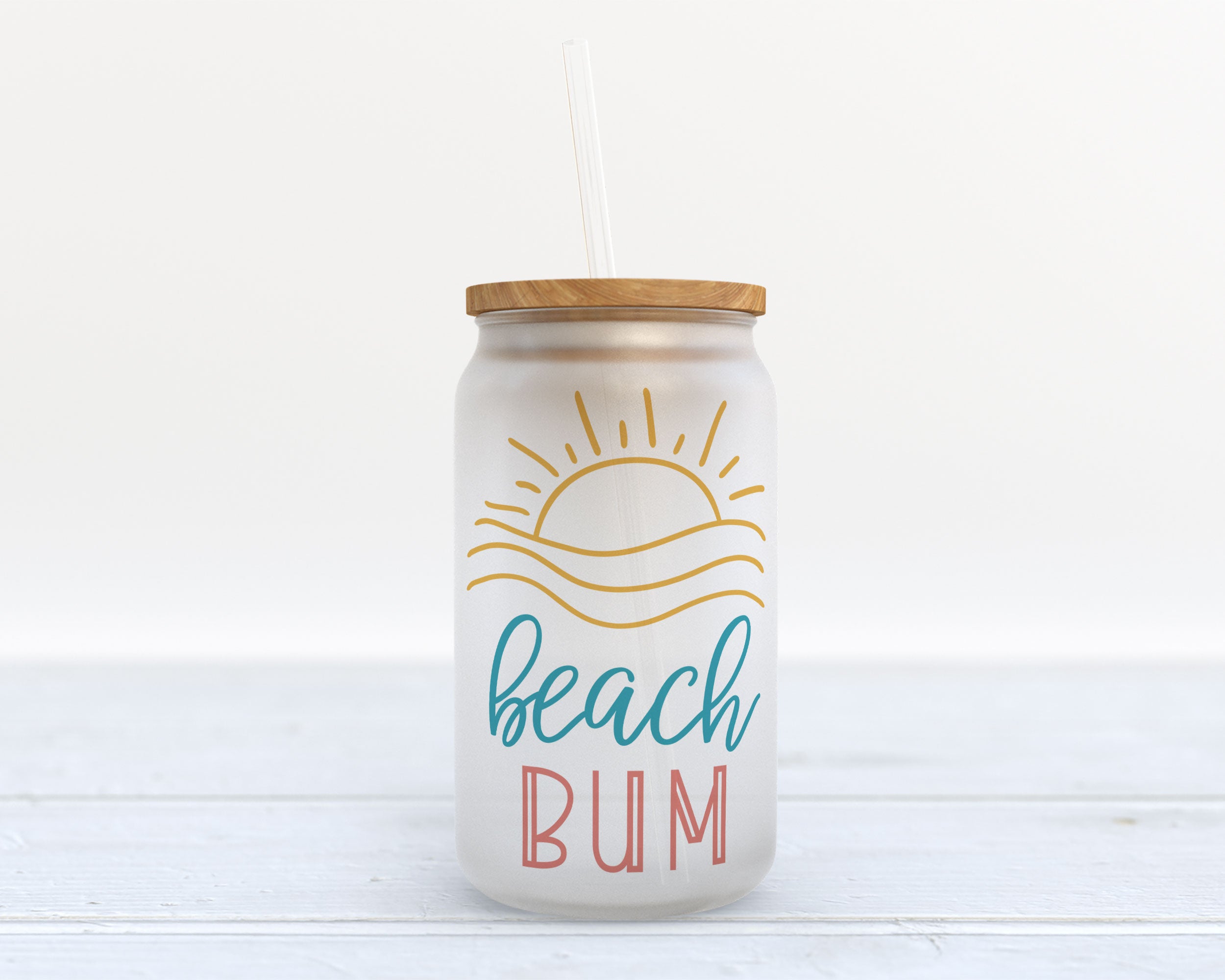 This Libbey glass can is 16 ounces, and comes with a bamboo lid and plastic straw. It is available is clear or frosted glass.