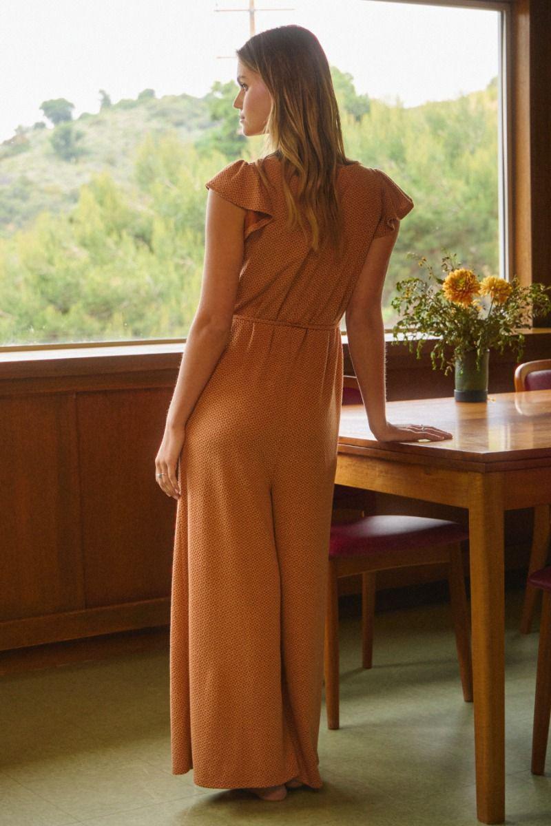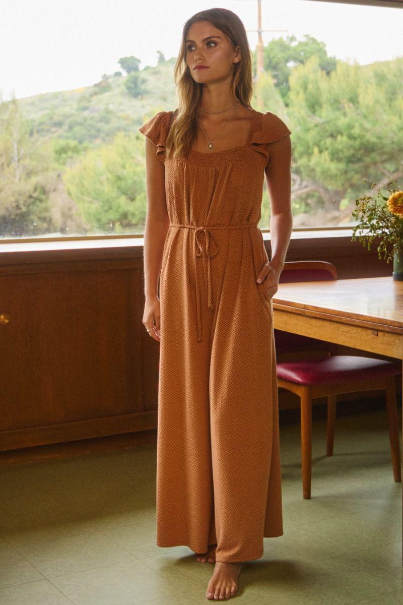 Jacquard flutter sleeve jumpsuit with smocking square neck with waist tie.