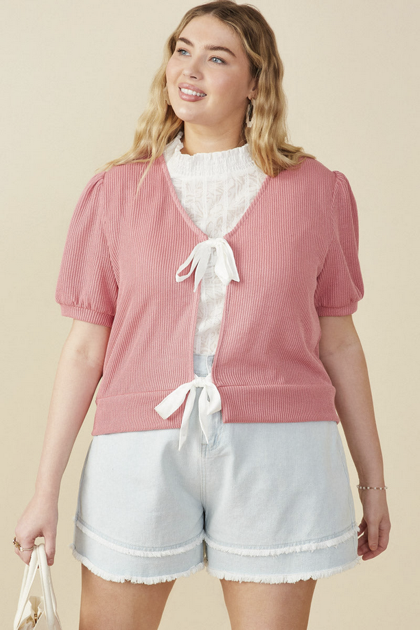 Ribbed Knit Bow Detail Short Sleeve Open Top