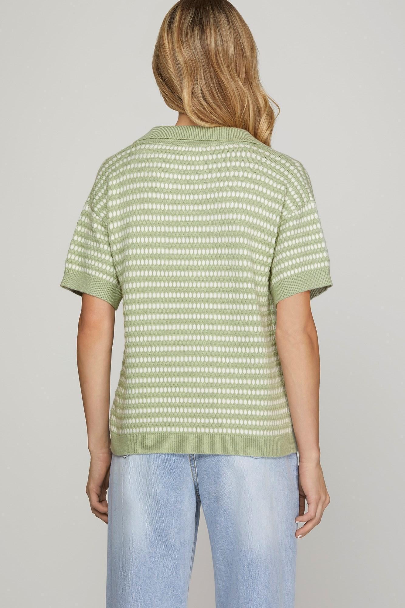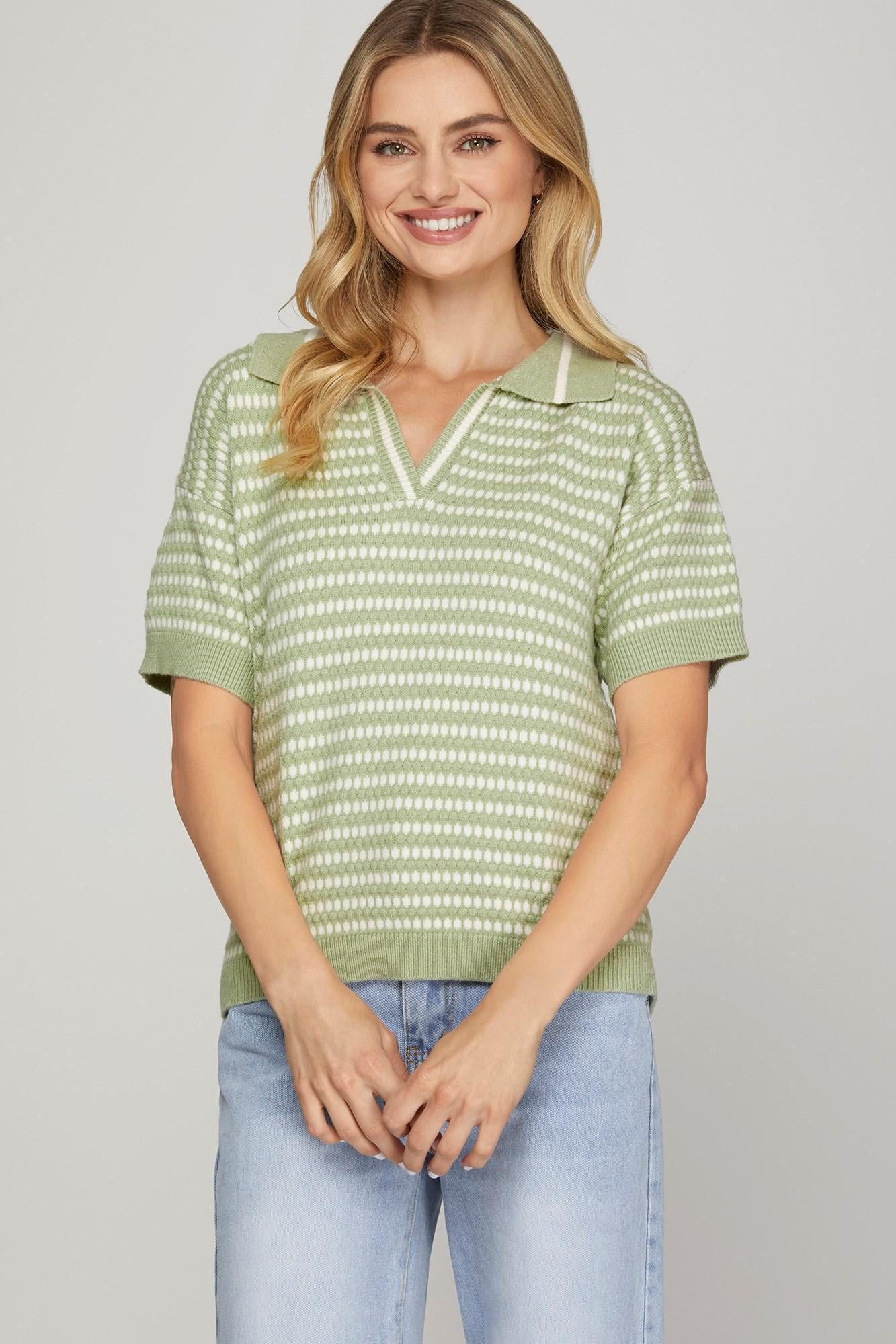 SHORT SLEEVE COLLARED STRIPE SWEATER TOP