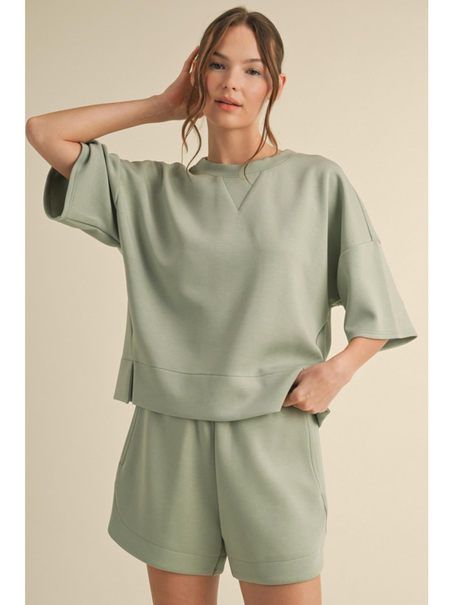 Solid loungewear sets Top with U-neck drop shoulder, half sleeves. Shorts are stretch-band waist, side pockets, and curved hemline.