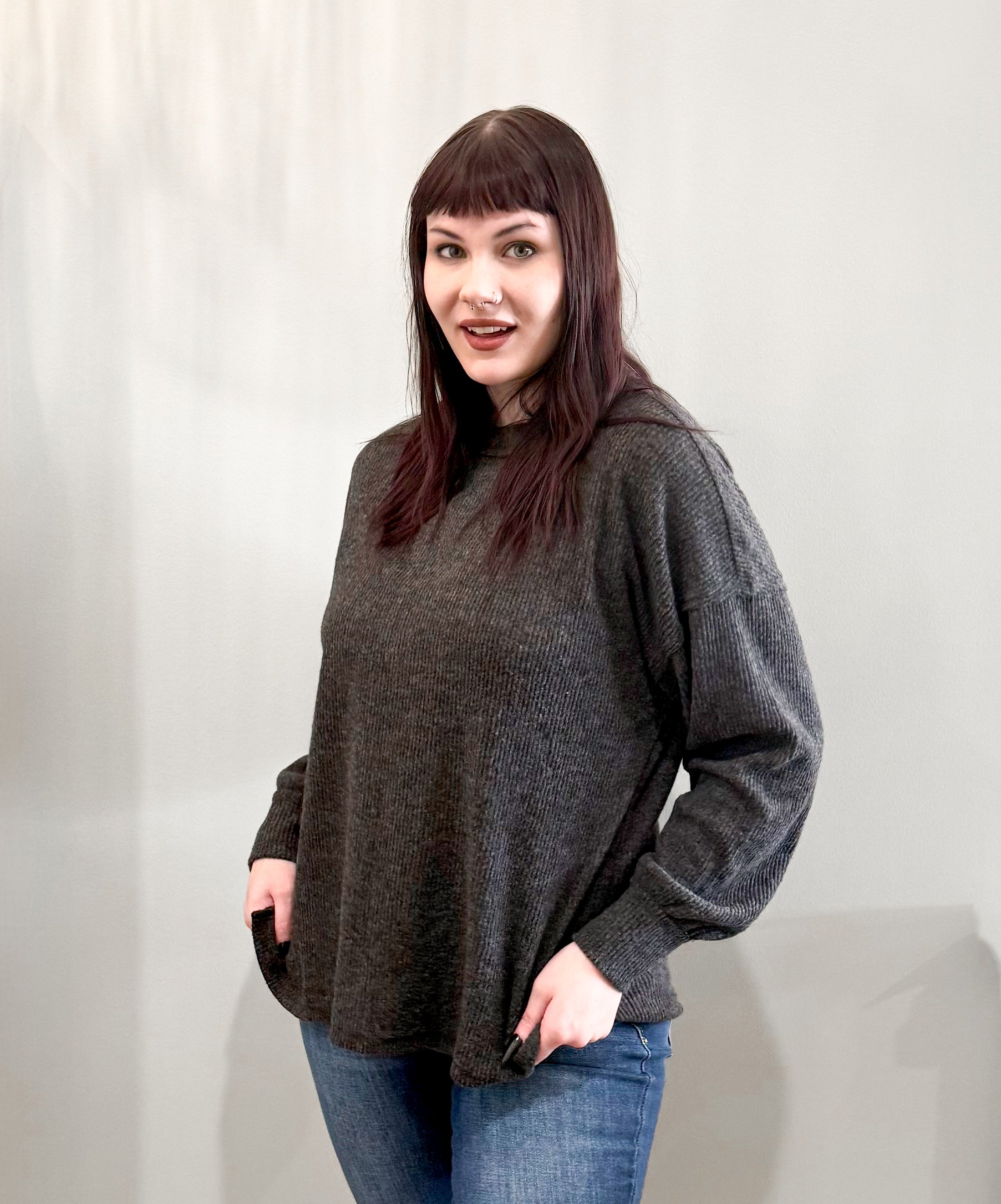 The Soft Brushed Rib Exposed Seam Sweater is that magical blend of comfy + cool that winter wardrobes absolutely need. Made from a super-soft brushed rib knit, this top gives you that “I could live in this” feel while the exposed seams and hi-low hem add the perfect touch of casual edge.