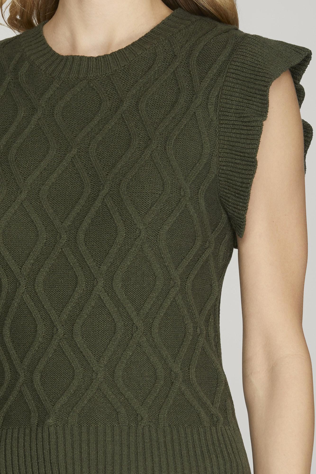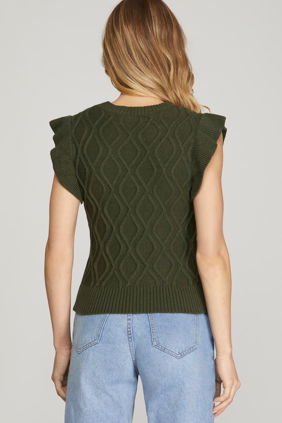 Add a touch of texture and charm to your fall lineup with the Ruffle Edge Cable Knit Top. Designed in a rich olive green, this sleeveless sweater top features a classic cable knit pattern with playful ruffle-trim sleeves that give it a feminine twist. Soft, medium-weight knit makes it the perfect layering piece for the season.
