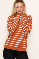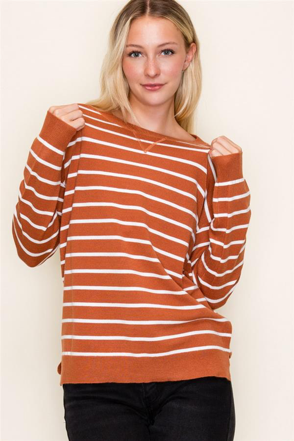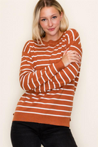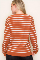Meet your new go-to for cozy casual days—the Copper Stripe Everyday Sweater. With its warm copper base and crisp ivory stripes, this crew neck pullover strikes the perfect balance between timeless and on-trend. Crafted from a soft and stretchy viscose-blend knit, it’s lightweight enough for layering but cozy enough to wear solo. An effortless choice for fall outings, pumpkin patch days, or casual Fridays at work.