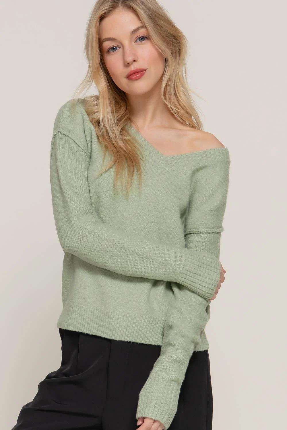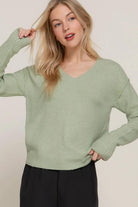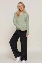 V-Neck Raised Seam Detail Sweater - Sage Green