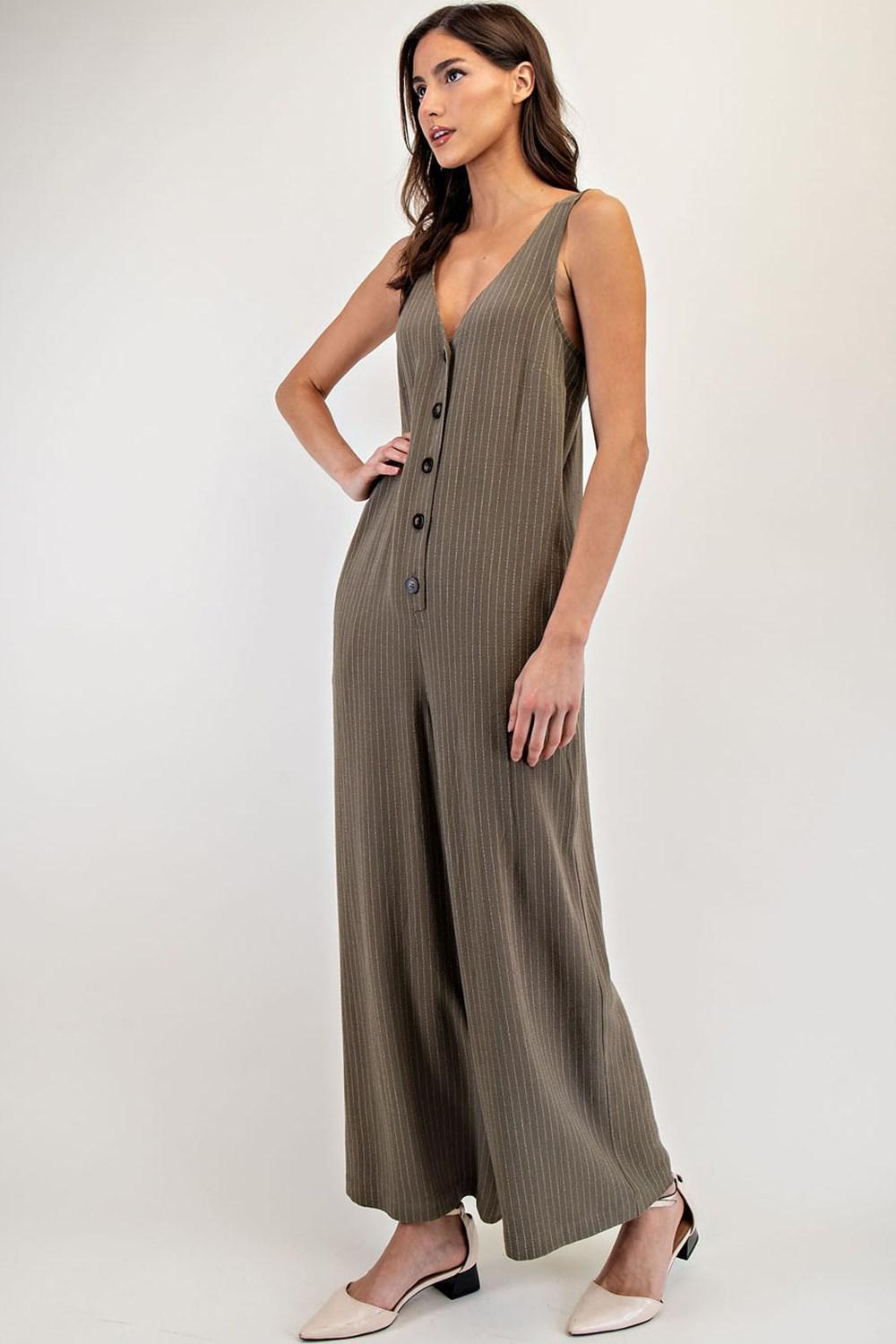 Meet your new wear-it-anywhere jumpsuit. Our Button Down Pinstriped Jumpsuit in a dry herb greenish-brown hue is effortless, versatile, and ready for just about anything on your calendar. Crafted from a breathable cotton-linen blend, it’s designed with a deep V-neckline, button-down front with chic tortoiseshell buttons, and a wide-leg silhouette that feels both modern and timeless. The adjustable straps, elastic back detail, and roomy side pockets bring comfort to the polished pinstripe finish.