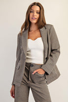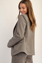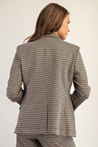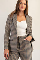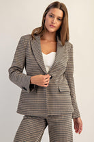 Elevate your wardrobe with the timeless sophistication of our Houndstooth Pattern Blazer. Designed with a classic single-button closure, structured lapels, and front flap pockets, this tailored piece brings effortless polish to both workwear and weekend looks. The all-over houndstooth print adds a chic, heritage-inspired vibe, while the back vent and buttoned cuffs keep the silhouette sharp yet comfortable. Pair it with the matching trousers for a head-to-toe power set, or style it with denim and boots for an elevated casual look.