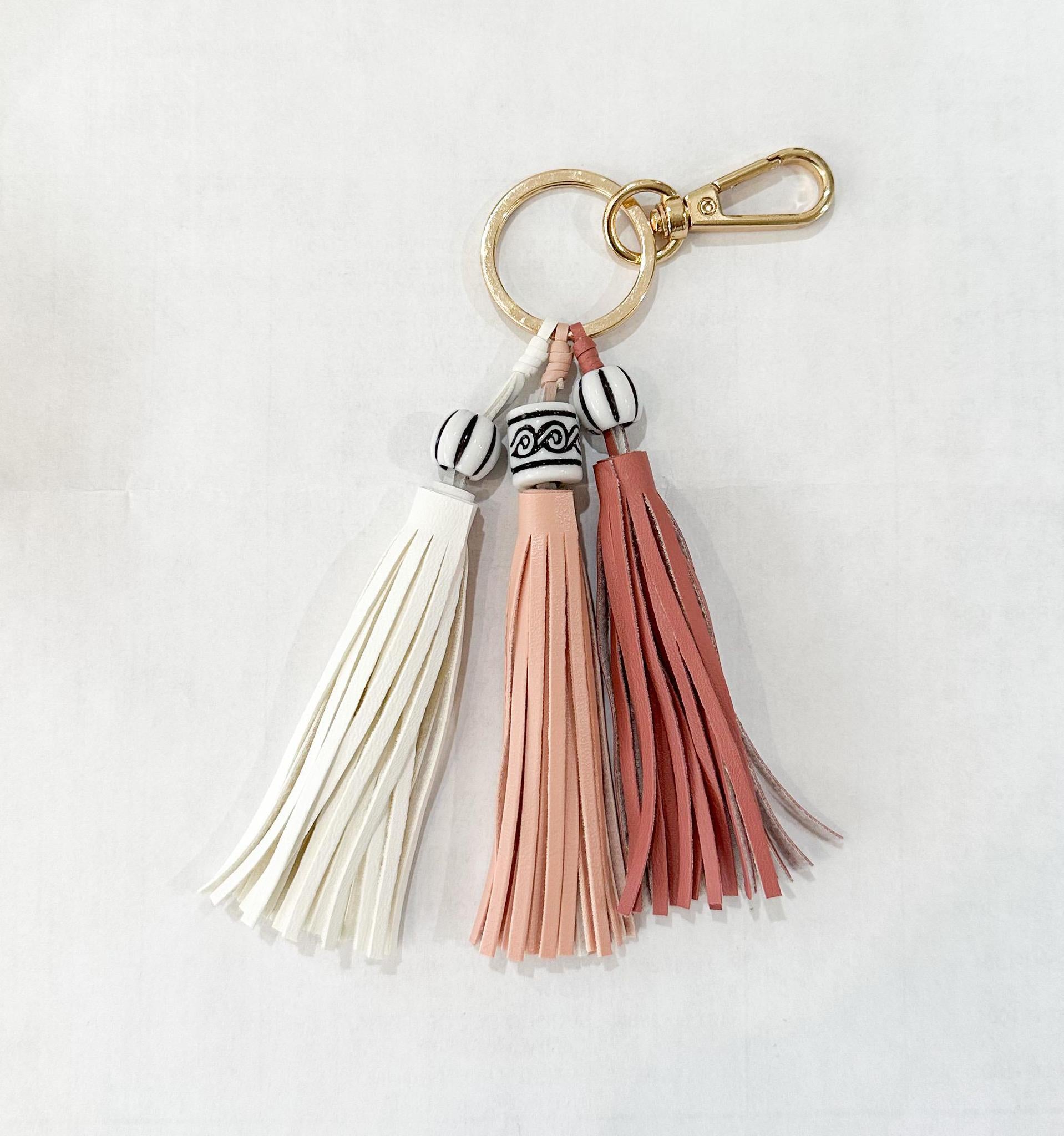 Add a playful yet polished touch to your everyday essentials with The Triple Tassel Keychain. Featuring three soft faux-leather tassels in coordinated tones, accented with black-and-white patterned beads, this accessory is both stylish and functional. The gold keyring and lobster clasp make it easy to clip onto your keys, handbag, or even a tote for a pop of personality.