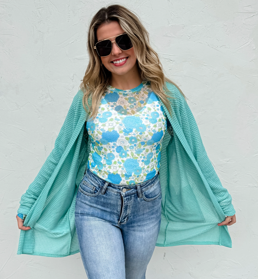Our new Spring Mesh Tops are HERE!! Super cute for layering! Stretchy mesh print long-sleeve top features a totally sheer design. Perfect worn alone or paired under your favorite cardigan, vest or sweater! Crew neck and thumbhole details sleeves.